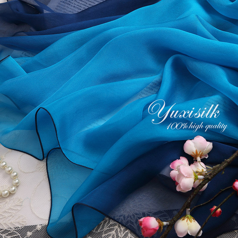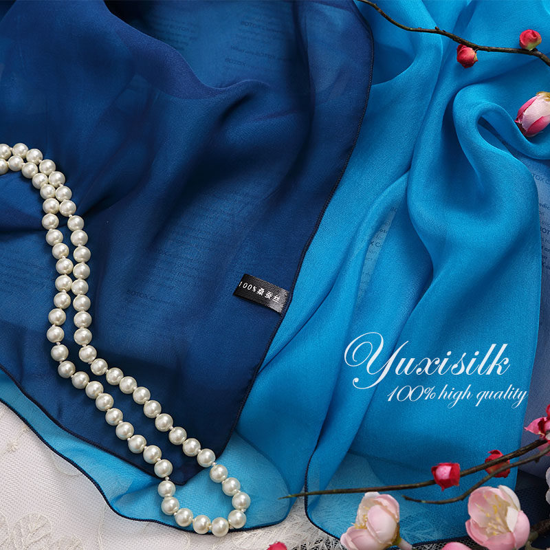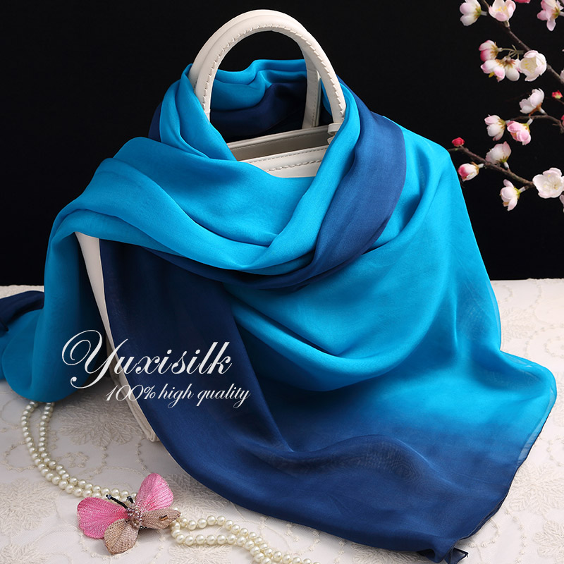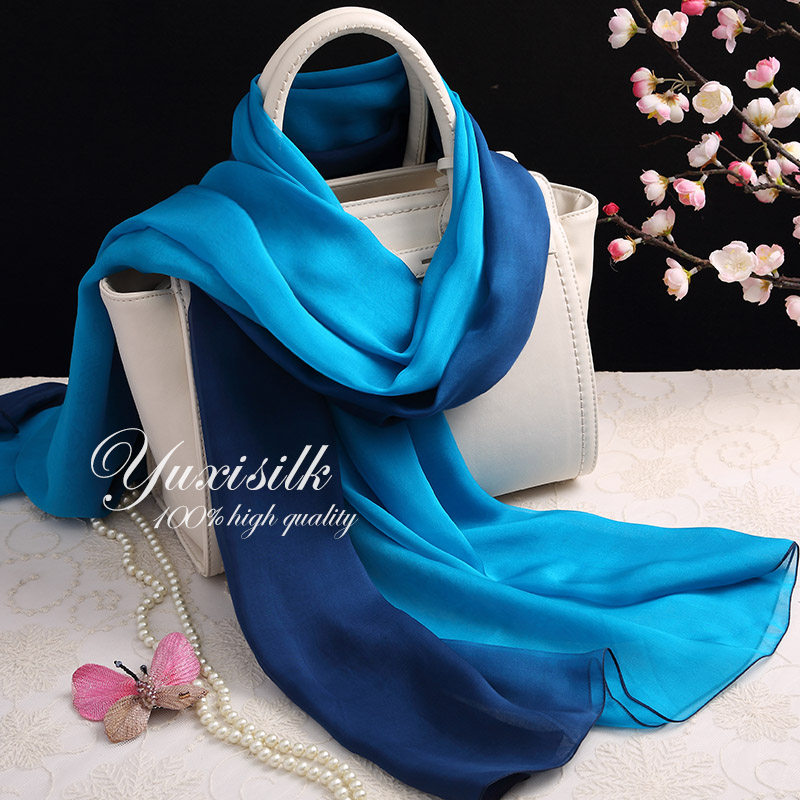 天猫蓝色渐变色100%桑蚕丝长款真丝丝巾围巾女披肩春秋冬夏季百搭纱巾
