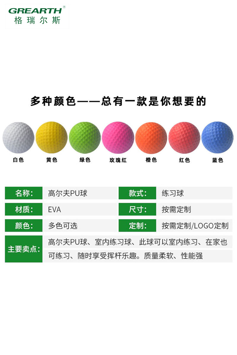 室内高尔夫练习软球采用环保PU材质或高密度海绵制成,安全无毒,质地柔软,撞击墙面或家具时不会造成损伤,特别适合家庭、办公室等室内环境使用。彩色设计不仅美观,还能提升儿童玩耍的趣味性,激发孩子对高尔夫运动的兴趣。泡沫材质轻盈,飞行轨迹稳定,便于初学者掌握击球技巧,同时降低运动风险。适用于儿童玩具、亲子互动、室内训练等多种场景,是培养手眼协调能力与专注力的理想选择。无论是高尔夫爱好者还是小朋友,都能在安全、轻松的环境中享受挥杆乐趣。