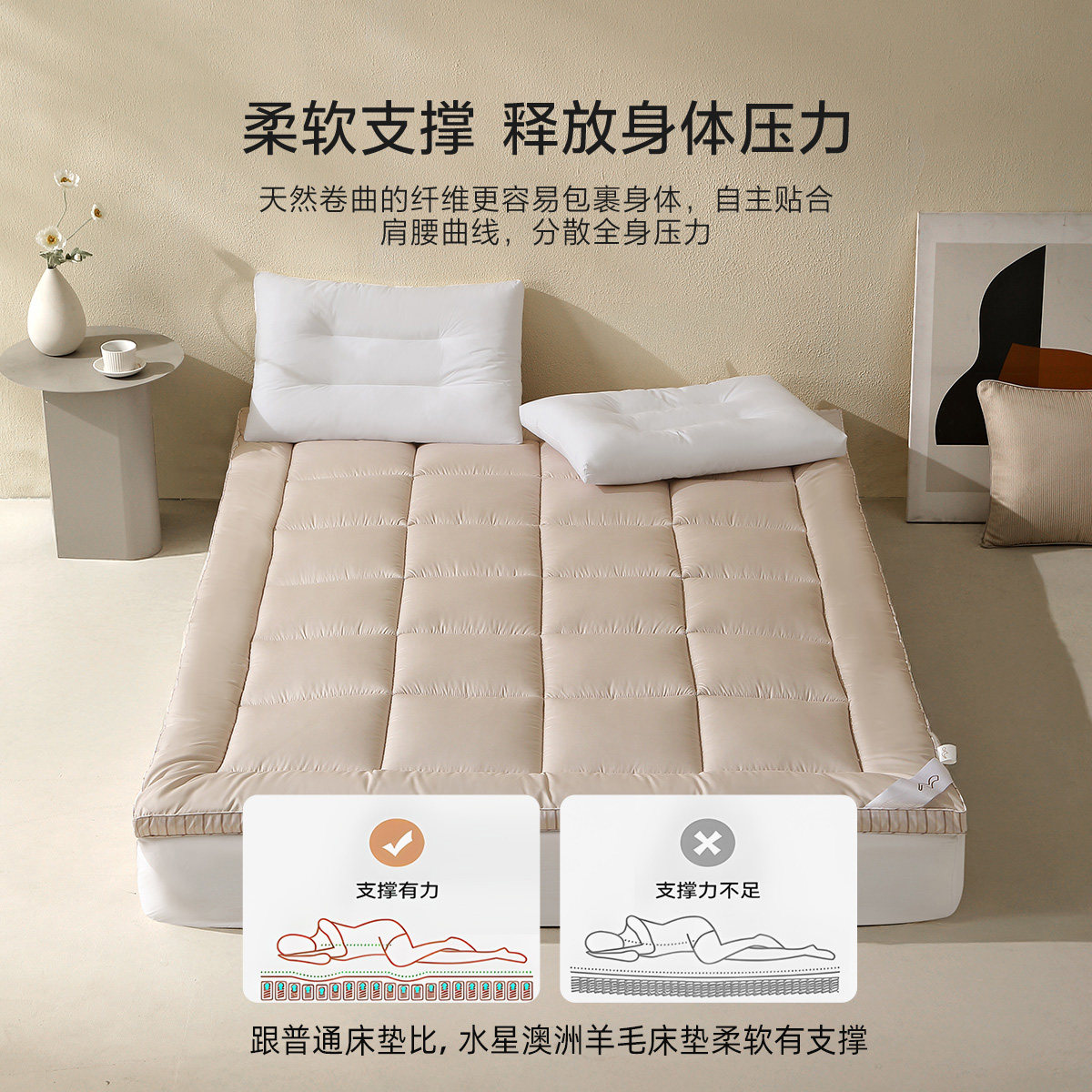 水星家纺澳洲羊毛床垫抑菌床褥垫,精选优质澳洲进口羊毛,天然亲肤、透气保暖,四季舒眠。采用先进抑菌工艺,有效抑制细菌滋生,呵护家人健康。加厚设计搭配高密度填充,柔软支撑脊椎,缓解疲劳,提升睡眠质量。适配榻榻米、地台床等多种床型,简约侘寂风外观,自然素雅,融入现代家居美学。防滑底面设计,稳固不位移,使用更安心。无论是冬日保暖还是夏日透气,皆能提供舒适体验,是追求品质生活家庭的理想之选。水星家纺,以匠心工艺打造安心好眠。