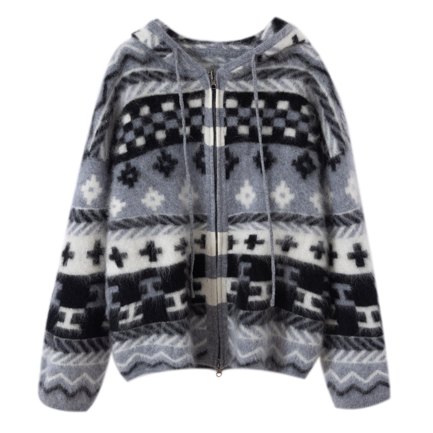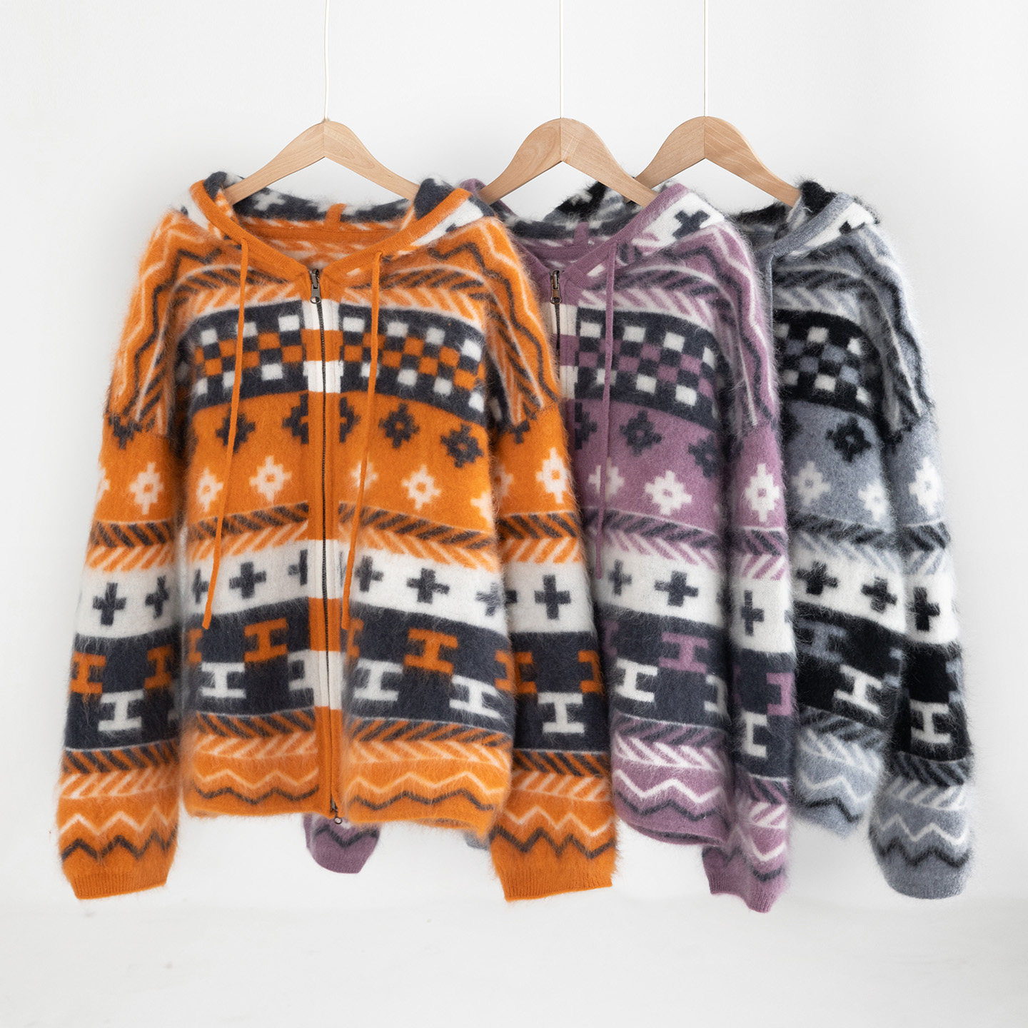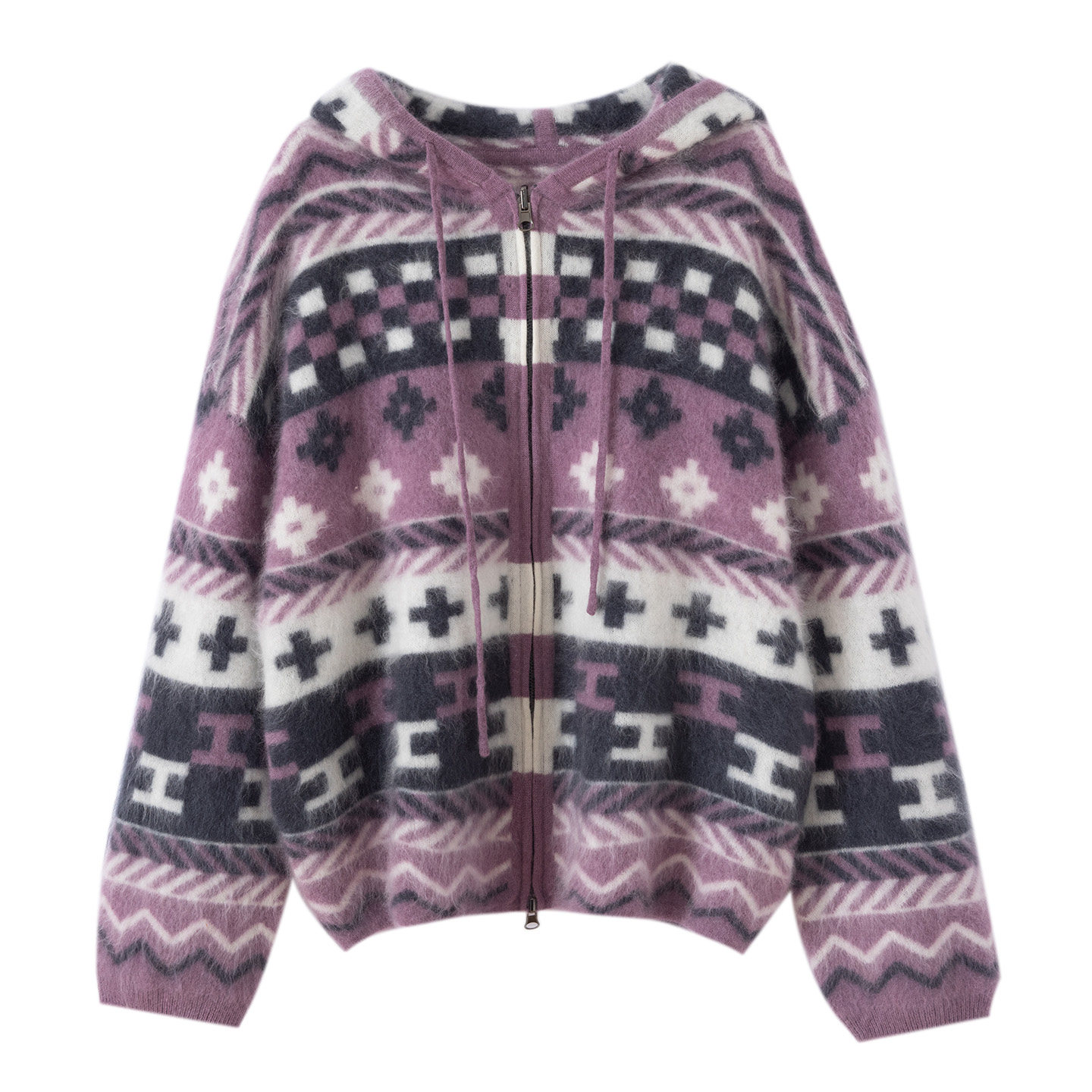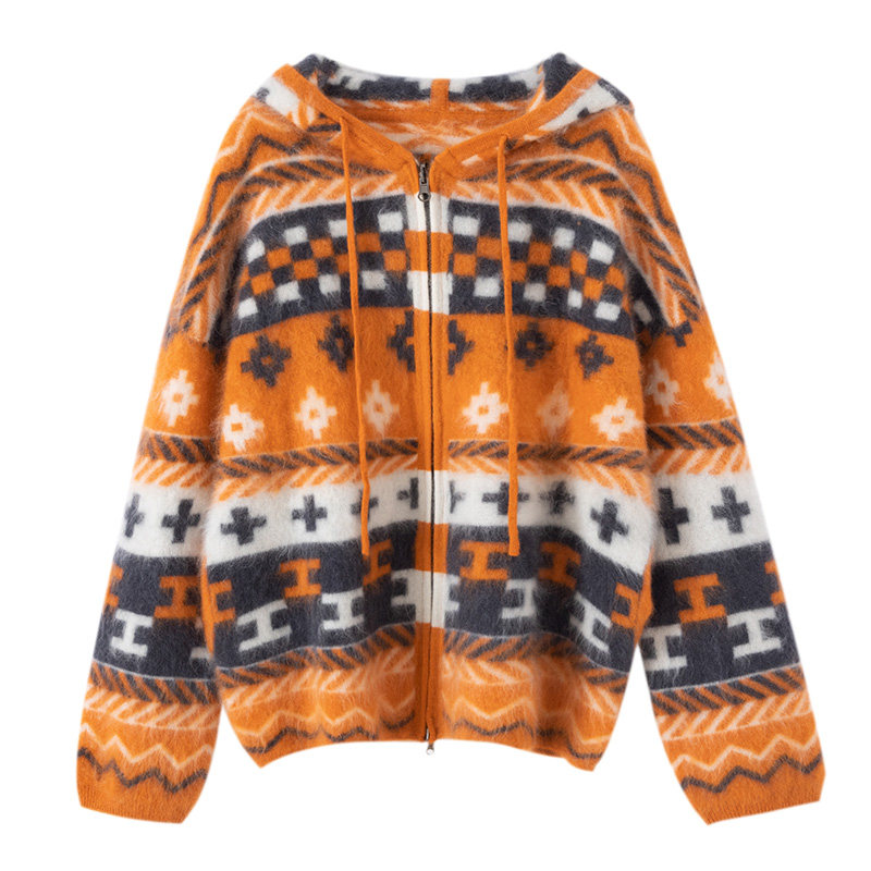 天猫秋冬新款100%山羊绒加厚拉绒外套女撞色提花设计连帽针织开衫保暖