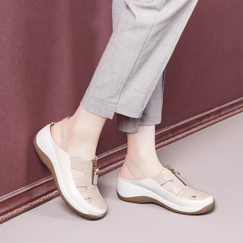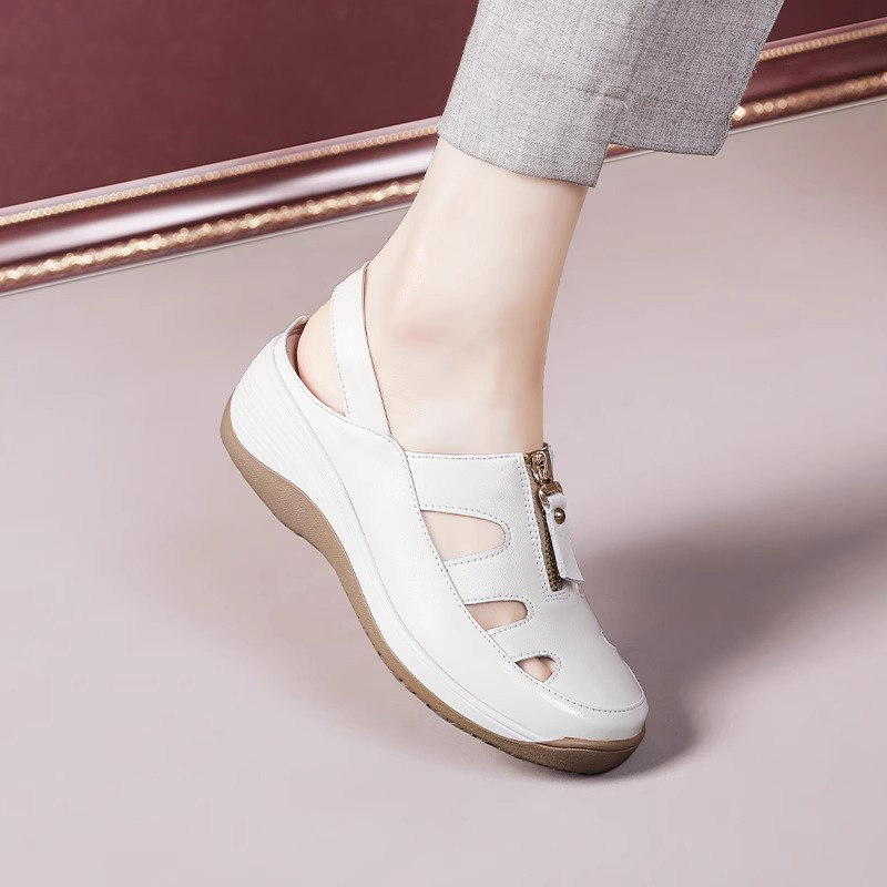 2026年夏季新款爆款包头凉鞋,专为中老年女性设计,兼顾舒适与时尚。采用镂空透气设计,有效排汗散热,久穿不闷脚;优质软底材质轻盈缓震,行走更轻松,呵护足部健康。经典坡跟造型,提升气质的同时保障稳定性,适合日常出行、散步或休闲场合。包头设计保护脚趾,安全贴心。鞋面选用柔软皮质,贴合脚型,久穿不磨脚。简约百搭风格,轻松搭配裙装或裤装,是妈妈们的理想之选。舒适、透气、防滑、耐穿,这款妈妈鞋集实用与美观于一体,今夏必备单品。