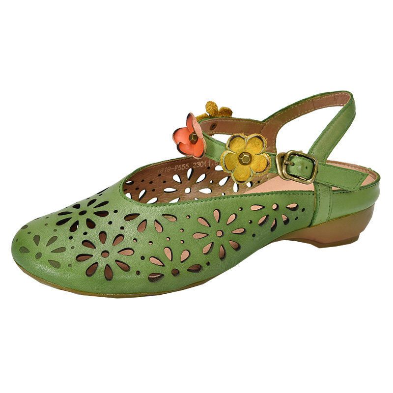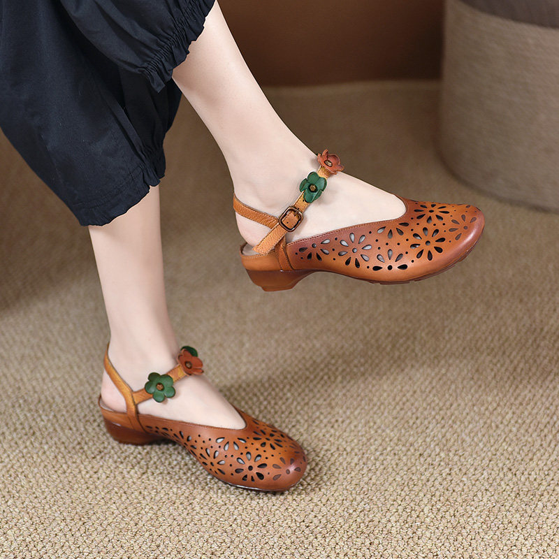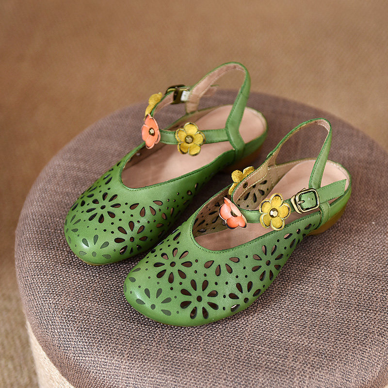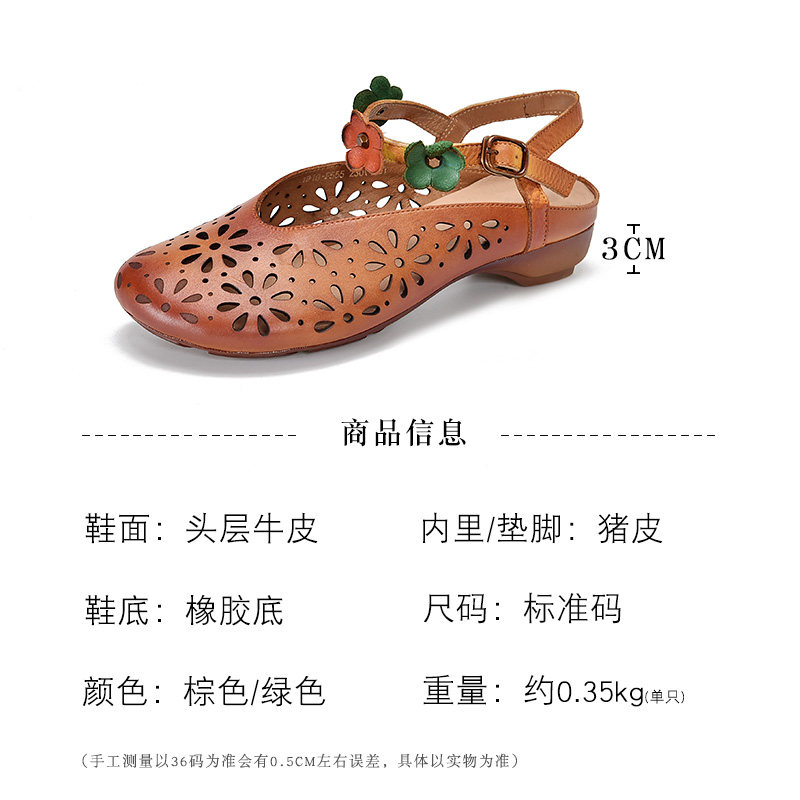 淘宝手工牛皮女鞋镂空夏季复古文艺浅口凉鞋中跟花朵鞋圆头包头露后跟