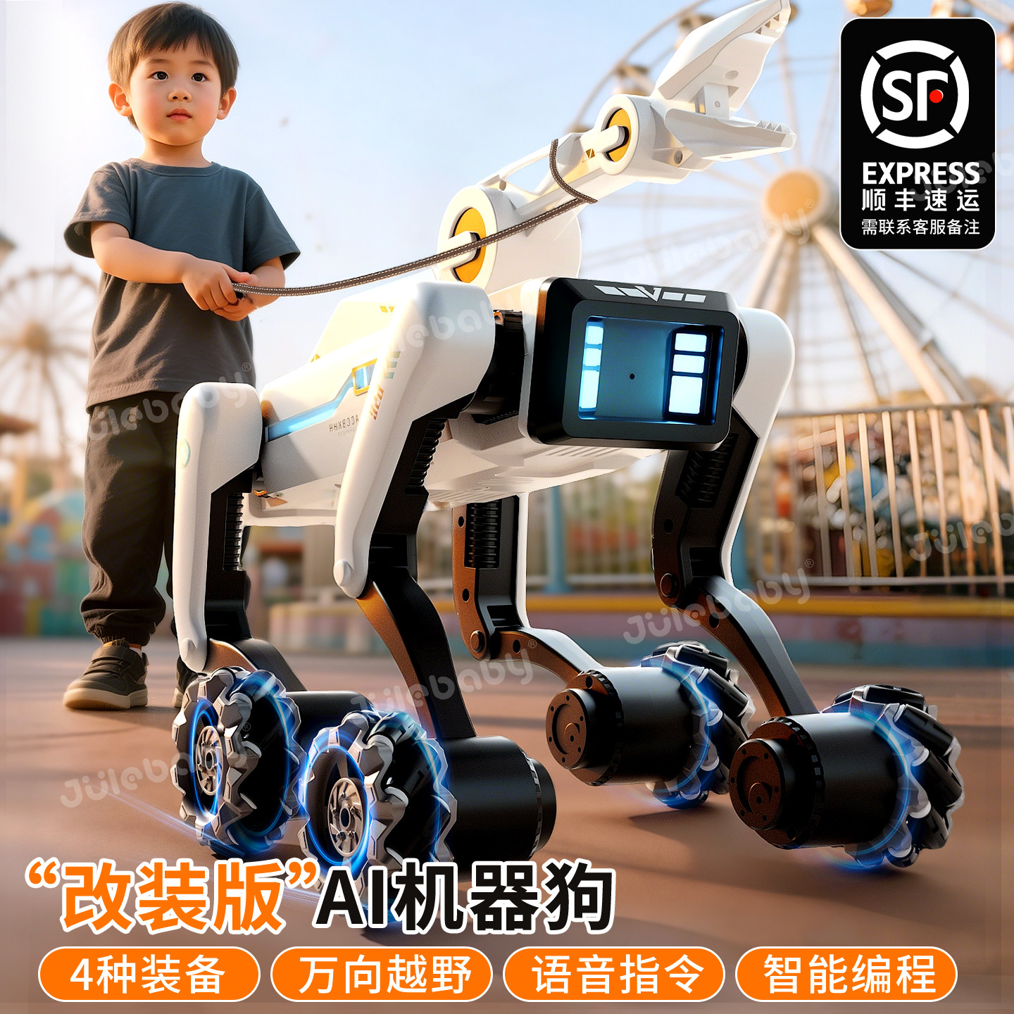 2026年全新智能机器狗,专为儿童打造,融合AI人工智能与趣味编程功能,是男孩梦寐以求的科技玩伴。它具备语音识别、自动避障、表情互动和舞蹈表演等功能,支持手机APP遥控及图形化编程,激发孩子逻辑思维与创造力。机身采用环保材质,安全耐用,内置多种传感器,可感知环境并做出拟人化反应。无论是陪伴学习、益智游戏,还是亲子互动,这款AI机械狗都能带来无限乐趣。支持中英双语交流,寓教于乐,助力孩子快乐成长。2026智能机器狗,不仅是玩具,更是孩子探索科技世界的启蒙伙伴。