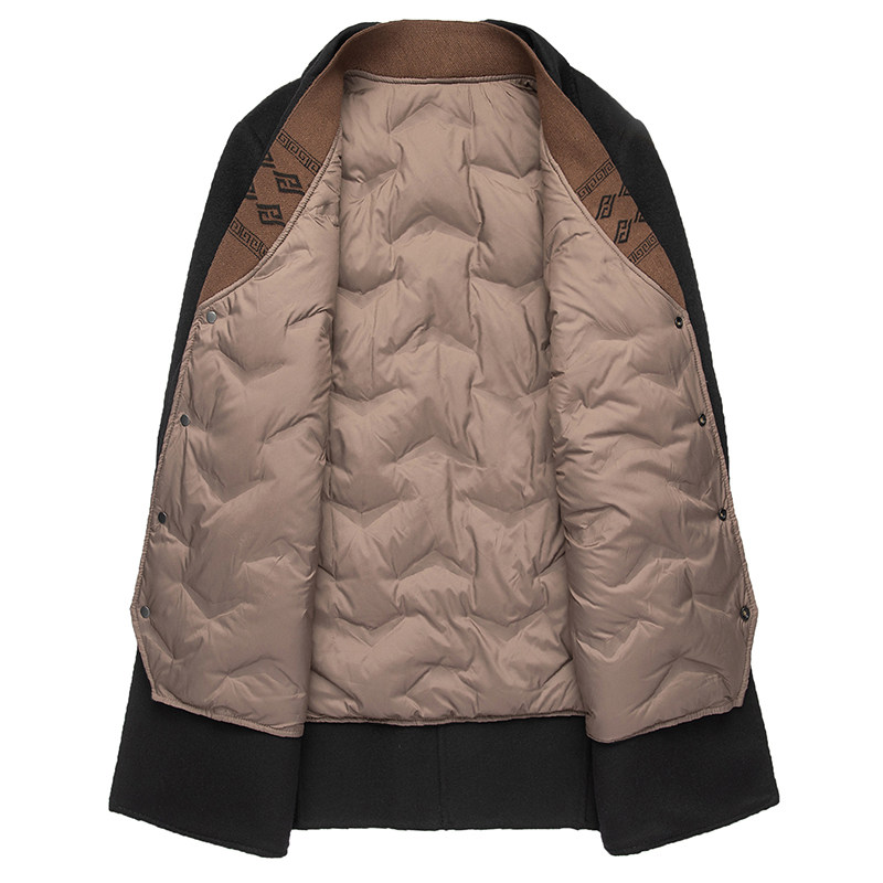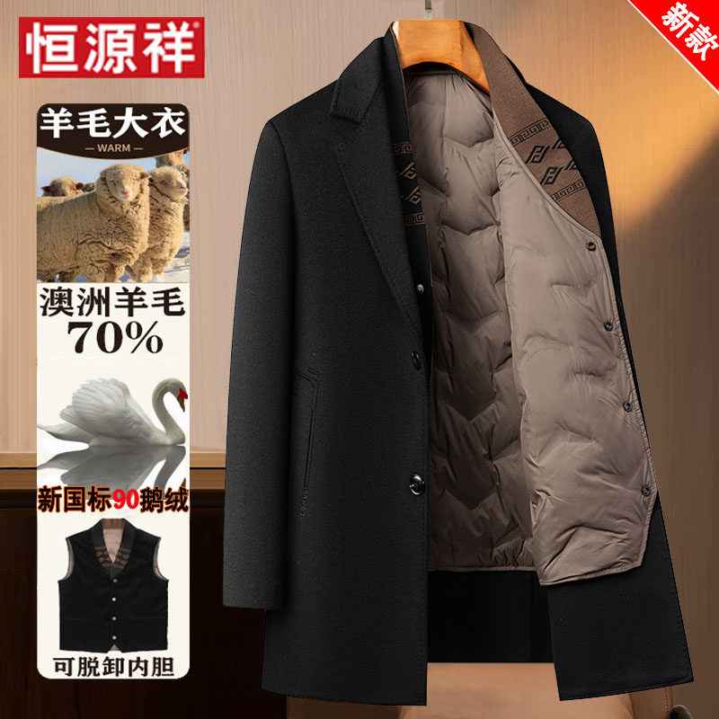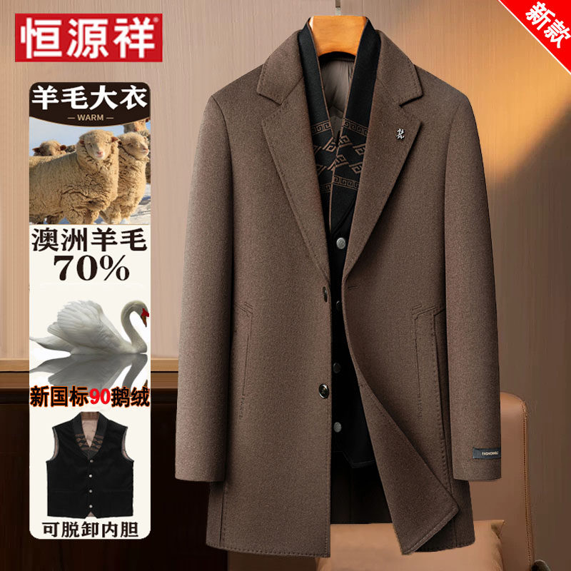 淘宝恒源祥羊毛呢大衣男士秋冬西装领鹅绒内胆中长款风衣双面羊绒外套