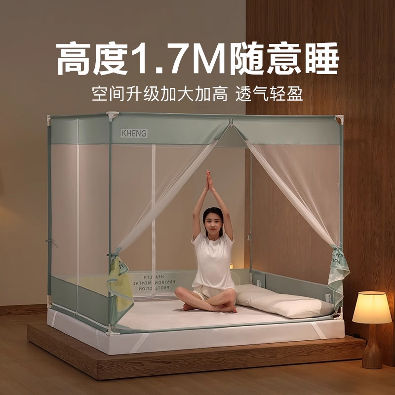 淘新型蚊帐带加粗不锈钢支架1.5加密加厚帐纱落地家用三开门防尘顶