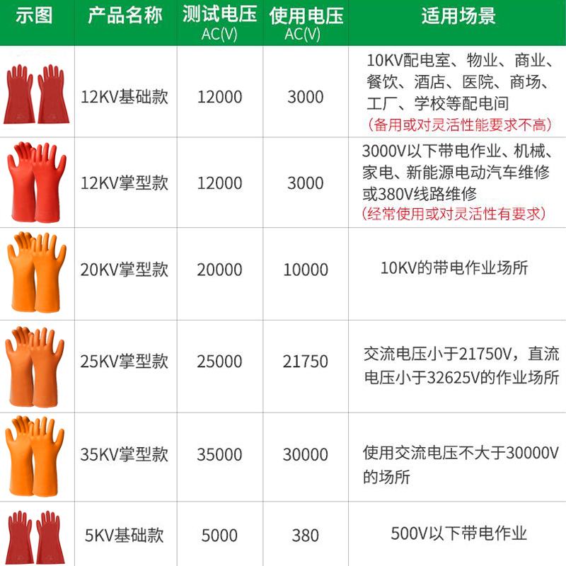 高压绝缘手套是电力作业中保障人身安全的重要防护装备,采用优质天然橡胶制成,具备优异的绝缘性、柔韧性和耐磨性。适用于10kV、12kV、35kV等不同电压等级(如220V、380V等)的带电作业环境,能有效防止触电事故。产品通过国家电气安全标准检测,具备防刺穿、防老化、防潮等性能,确保在高湿、复杂工况下仍保持可靠绝缘。广泛用于变电站、配电线路、电力施工等场景,是高压电工进行带电操作、设备检修时的必备防护用品。使用前需检查外观无破损,并定期进行耐压试验,确保作业安全。
