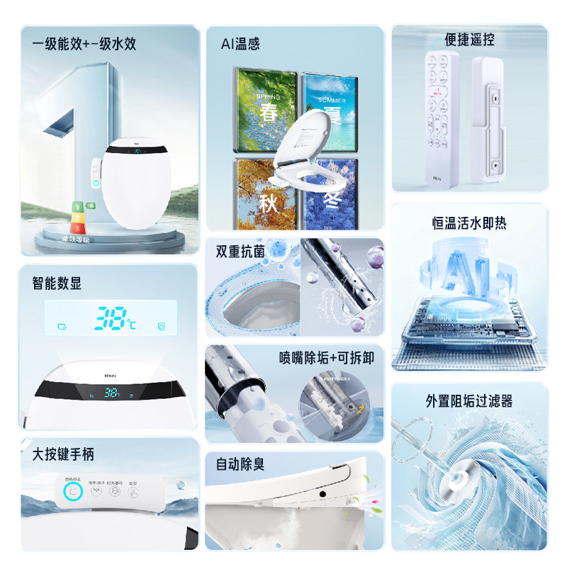 海尔智能马桶盖V3专为适老化设计,集自动除臭、助畅清洗与数显双控于一体,提升如厕舒适体验。其内置高效除臭系统,实时吸附异味,保持空气清新;助畅清洗功能采用恒温水流,温和按摩促进肠道蠕动,特别适合老年用户。配备高清数显面板,温度、水压一目了然,操作直观简便;支持座圈加热、多档水温调节及暖风烘干,四季皆宜。双控设计(面板+遥控器)满足不同使用习惯,安装便捷,适配多数马桶。V3以人性化科技与贴心细节,守护家人健康,让智能生活更温暖安心。