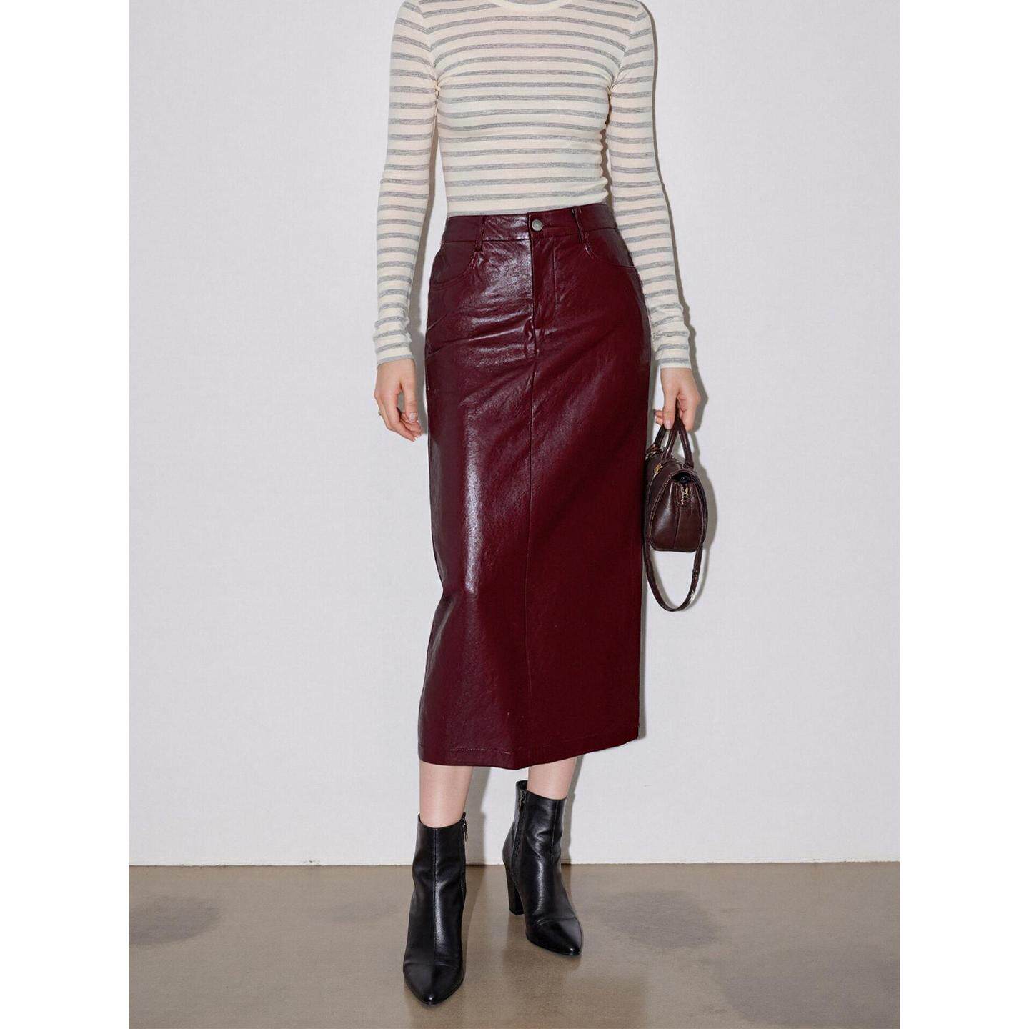 天猫Basic House/百家好PU皮裙半身裙女春季高腰中长款包臀直筒一步裙