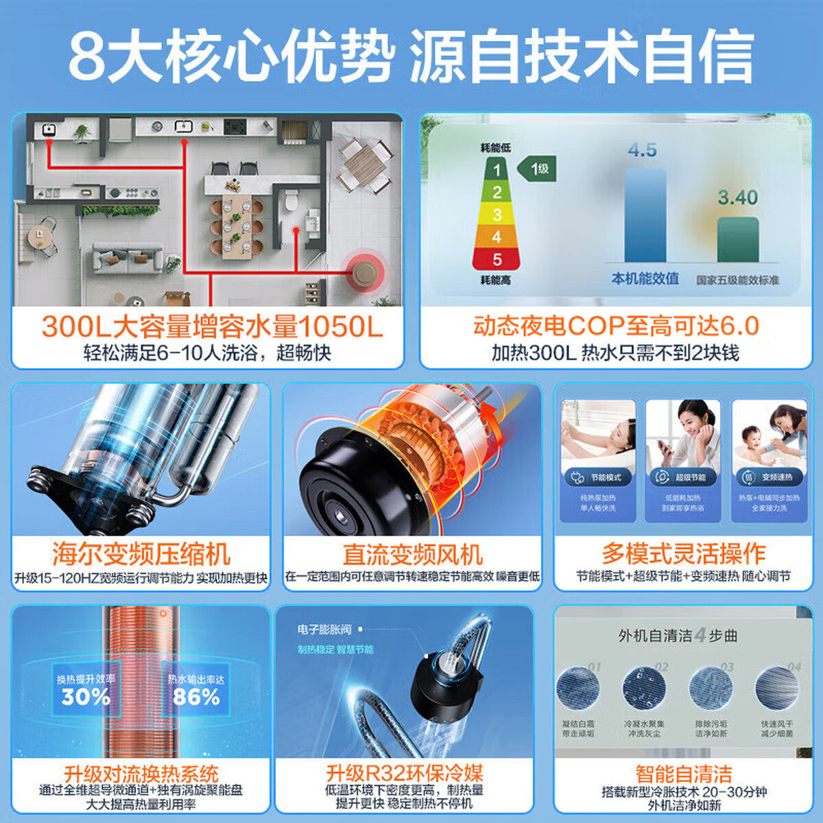 淘宝海尔变频300升统帅超一级能效空气能热水器大2匹速热智能净水洗