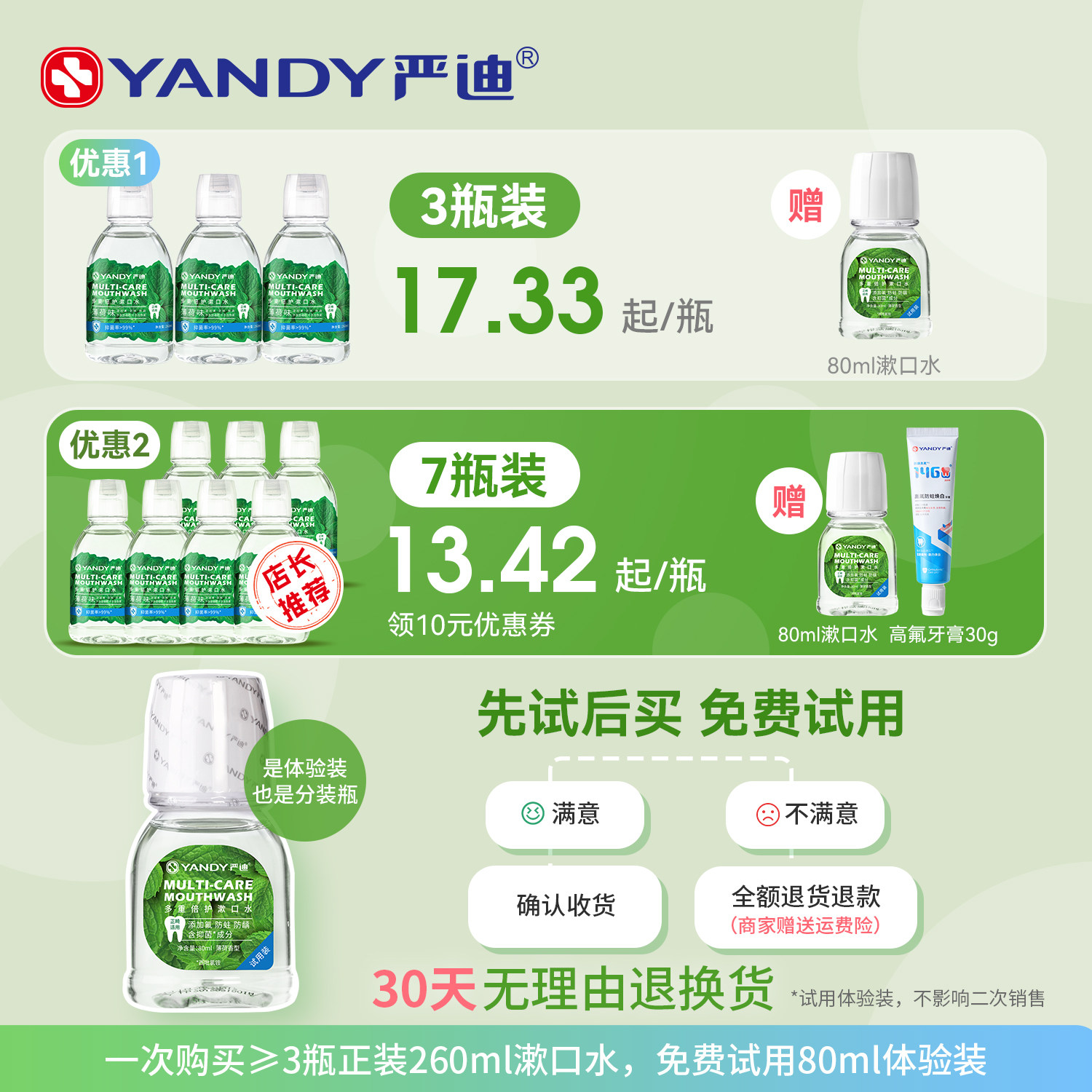 天猫严迪含氟漱口水杀菌抑菌正畸专用防蛀便携无酒精除口臭清新口气