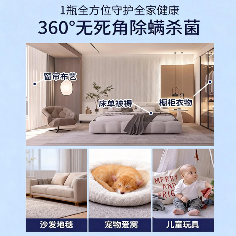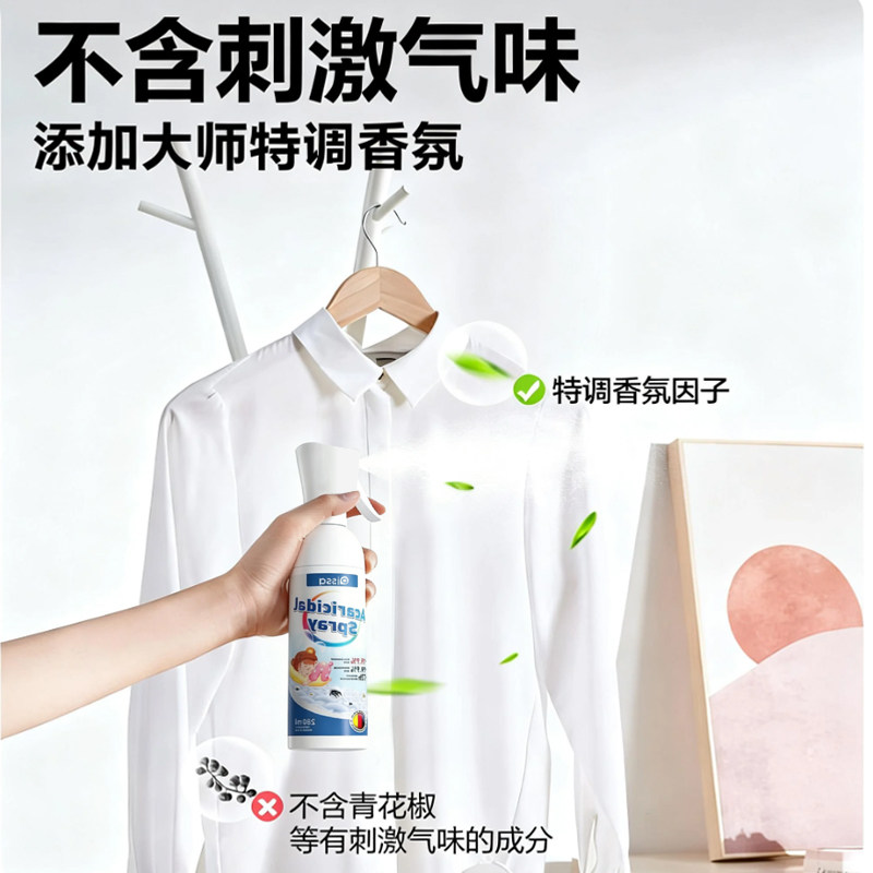 这款家用除螨喷雾专为床铺、被子、宠物窝等日常环境设计,采用温和高效配方,无需水洗即可快速杀灭螨虫、细菌及过敏原,适合宿舍、家庭等多种场景使用。喷雾细腻均匀,渗透力强,能深入织物纤维,有效抑制螨虫滋生,同时去除异味,保持环境清新。成分安全环保,对宠物和人体无害,孕妇、儿童亦可安心使用。免洗设计省时省力,喷洒后自然风干即可,是守护家人健康、改善睡眠质量的实用神器。定期使用,可显著降低过敏风险,营造洁净舒适的居家环境。