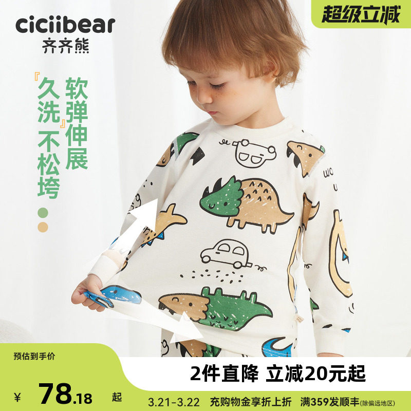 天猫[fufu棉5A抗菌]齐齐熊宝宝纯棉A类内衣套装男童睡衣儿童秋衣秋裤