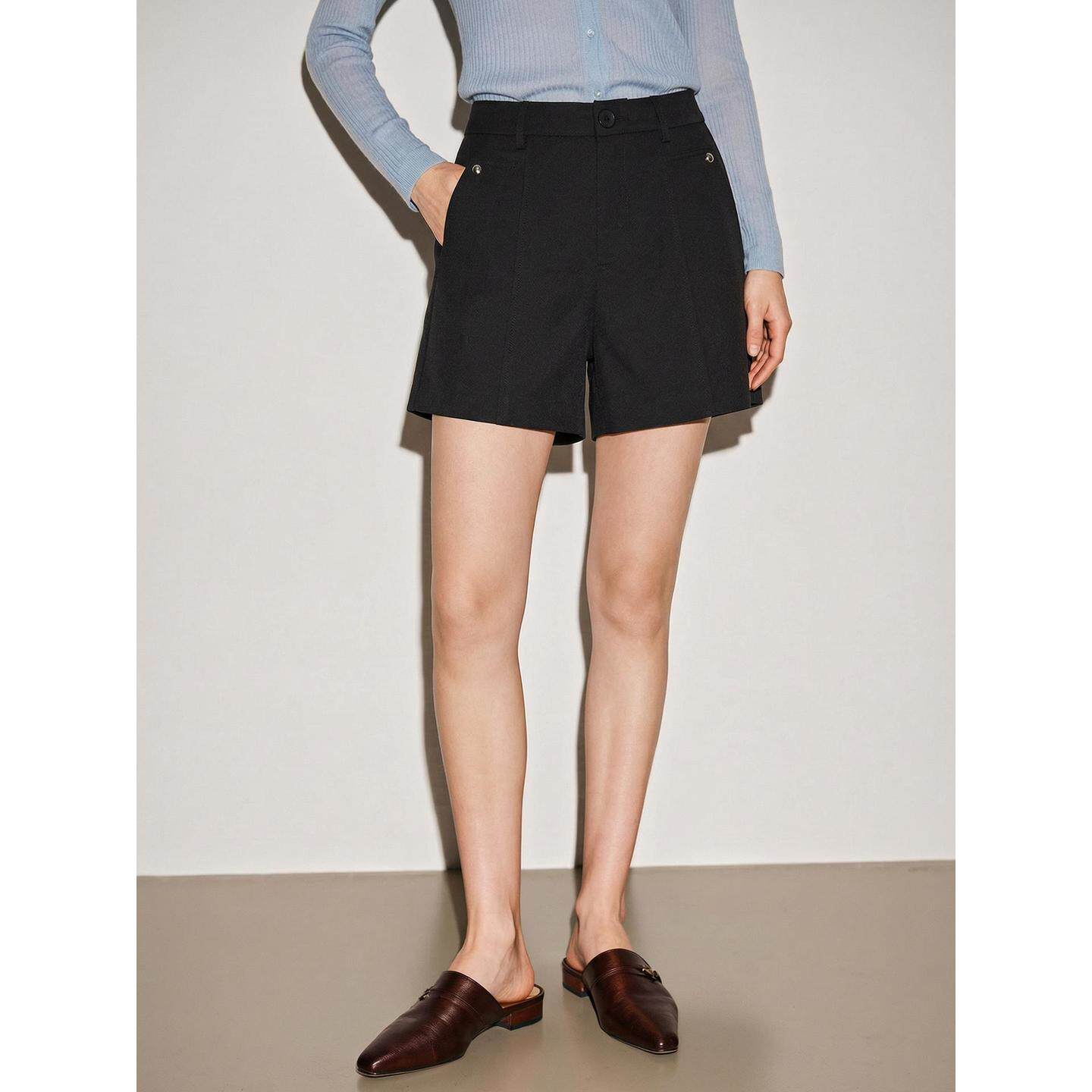 BasicHouse/百家好推出的这款通勤风黑色西装短裤,专为都市女性夏季穿搭设计。采用高腰阔腿直筒版型,巧妙拉长腿部线条,显瘦又显高。精选挺括有型的西装面料,质感高级,透气舒适,适合日常通勤或轻商务场合外穿。简约利落的剪裁搭配经典黑色,百搭易穿,可轻松搭配衬衫、T恤或针织衫,打造干练又不失时尚感的职场造型。侧边隐形拉链设计,细节精致,穿脱便捷。无论是办公室、会议还是休闲出行,都能展现优雅自信的都市女性魅力,是夏季衣橱不可或缺的实用单品。