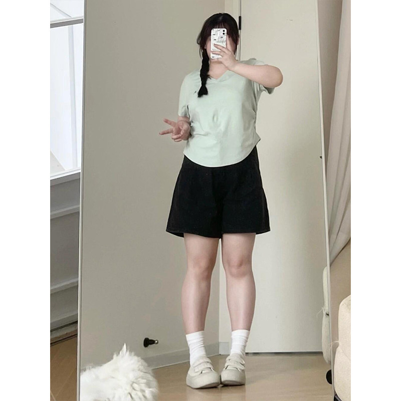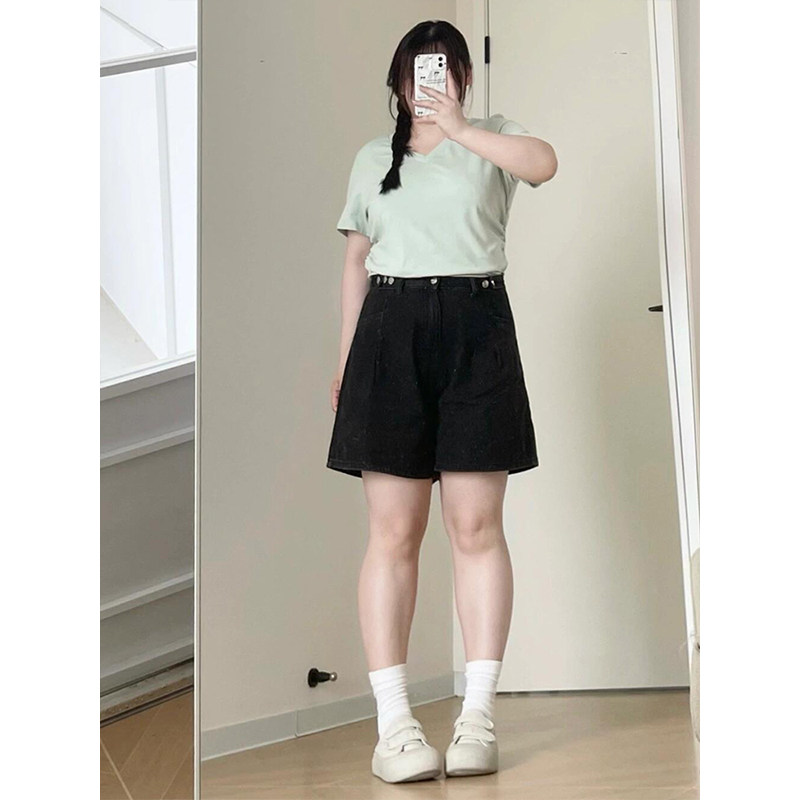 淘宝300斤大码女装夏季黑色牛仔短裤女胖mm宽松显瘦裤子松紧腰五分裤