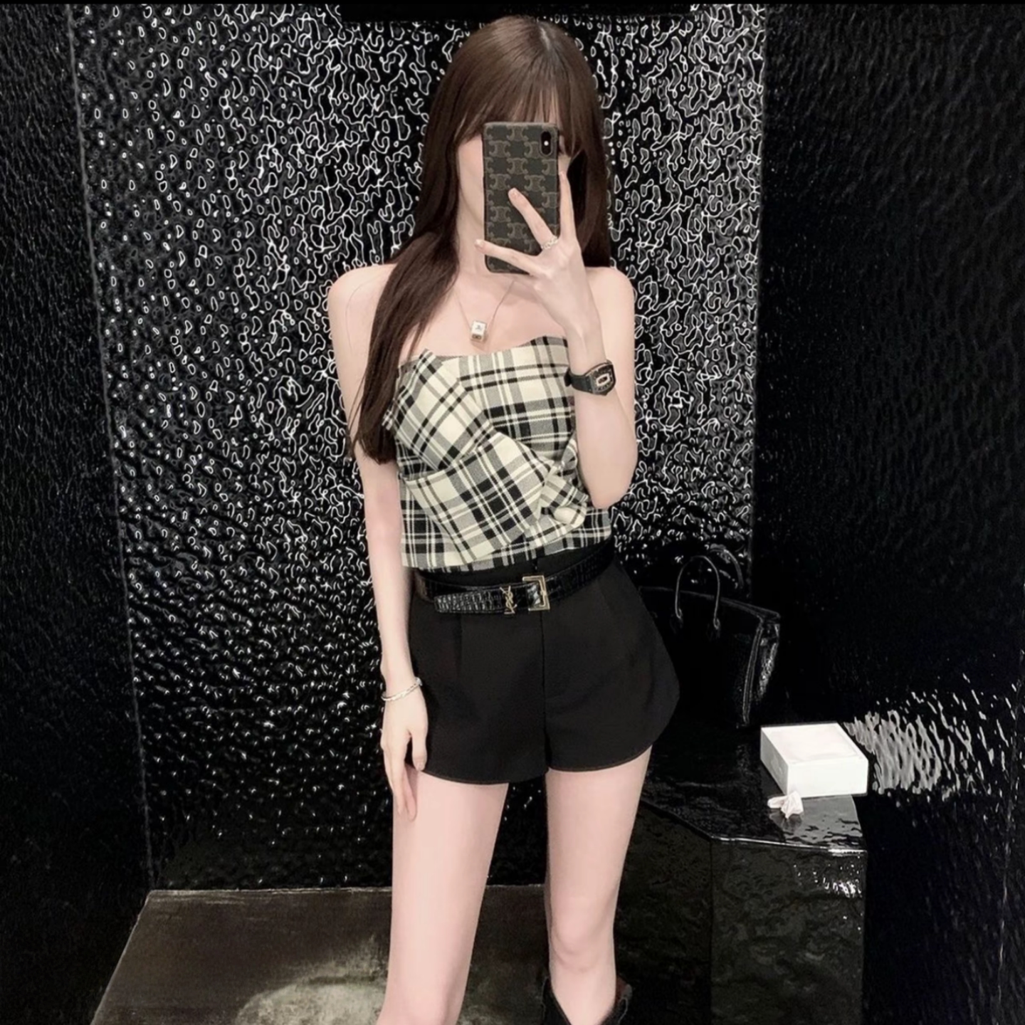 SylCue 拽酷辣妹机车风V领显瘦不规则PU皮抹胸背心高腰短裤两件套