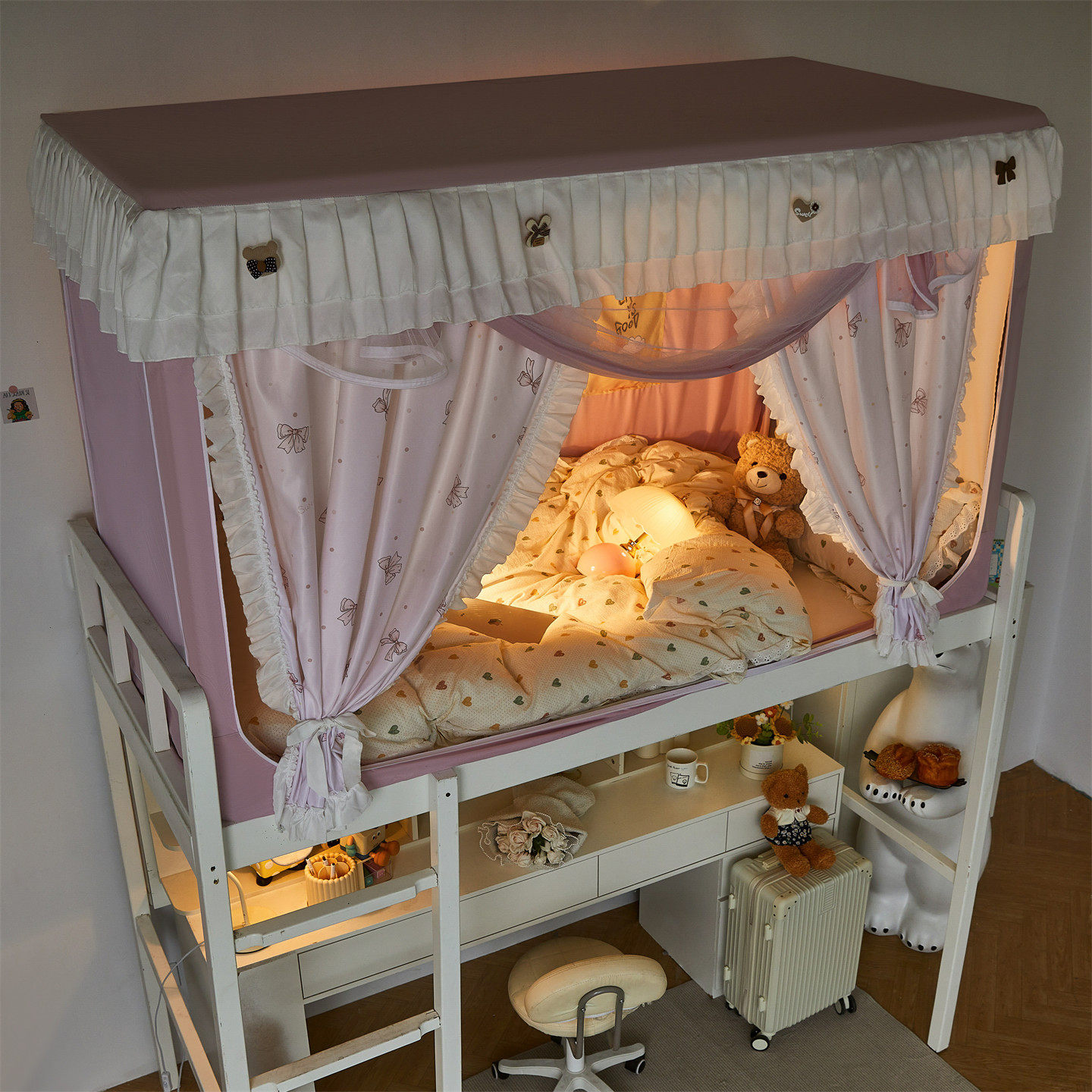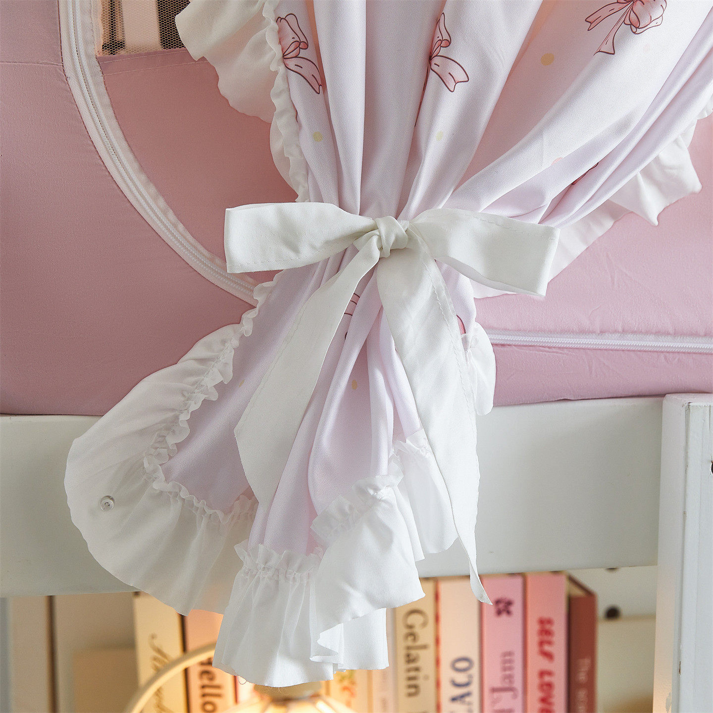 这款大学生宿舍床帘蚊帐全包一体式双层设计,专为寝室环境打造,上下铺通用,安装简便。外层采用高密度遮光布,有效阻挡光线,营造私密安静的休息空间;内层为透气防蚊网,夏季防蚊虫叮咬,四季防尘防灰。全包式设计360°围挡,顶部加固支架稳固承重,不晃动、不塌陷。整体风格清新甜美,公主风蕾丝花边点缀,兼顾实用与美观,提升宿舍生活品质。面料环保亲肤、易清洗,适合集体生活使用,是大学生打造个性、舒适睡眠空间的理想选择。