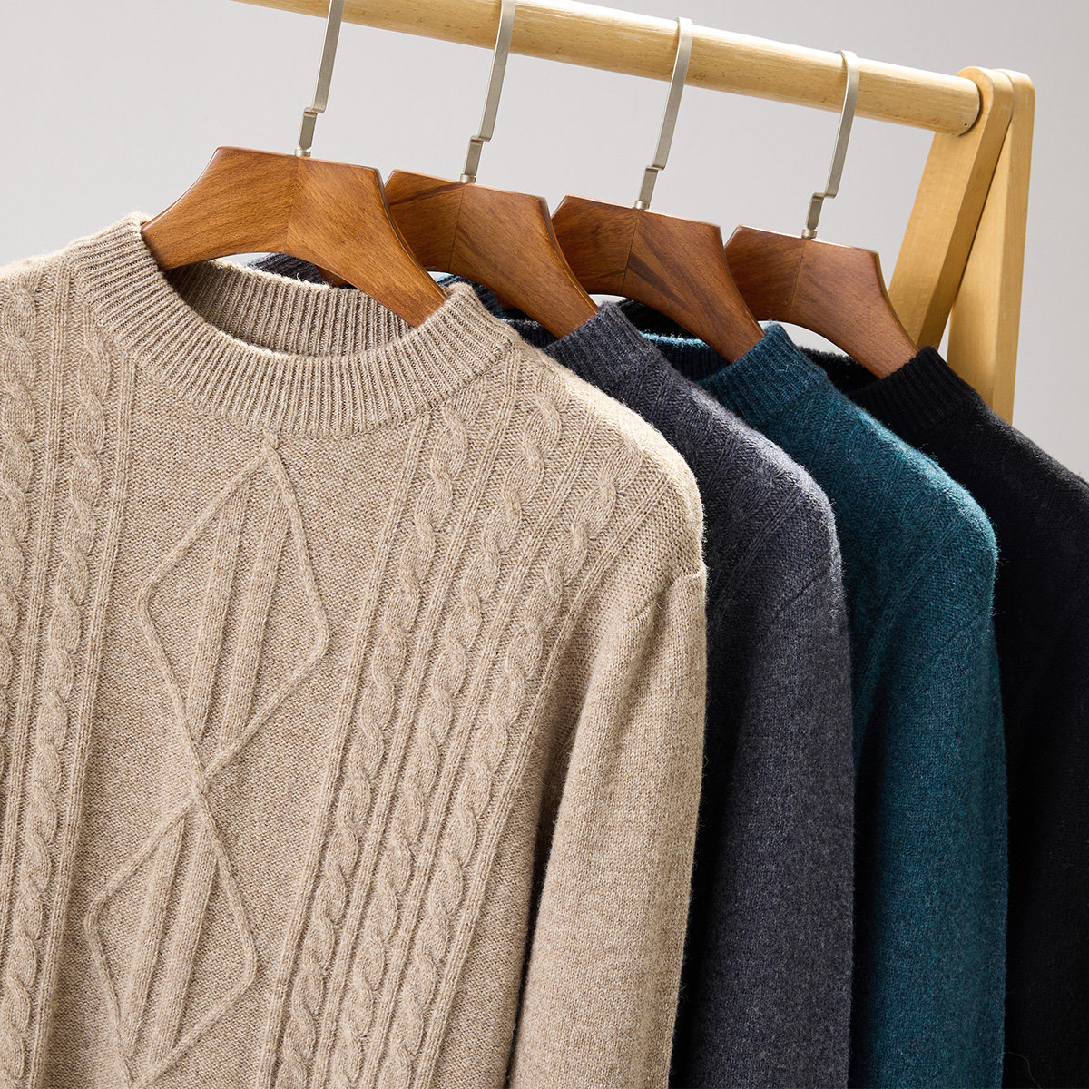淘450g 定制款 26支双股全羊绒 男士绞花圆领毛衣 针织衫 秋冬男装