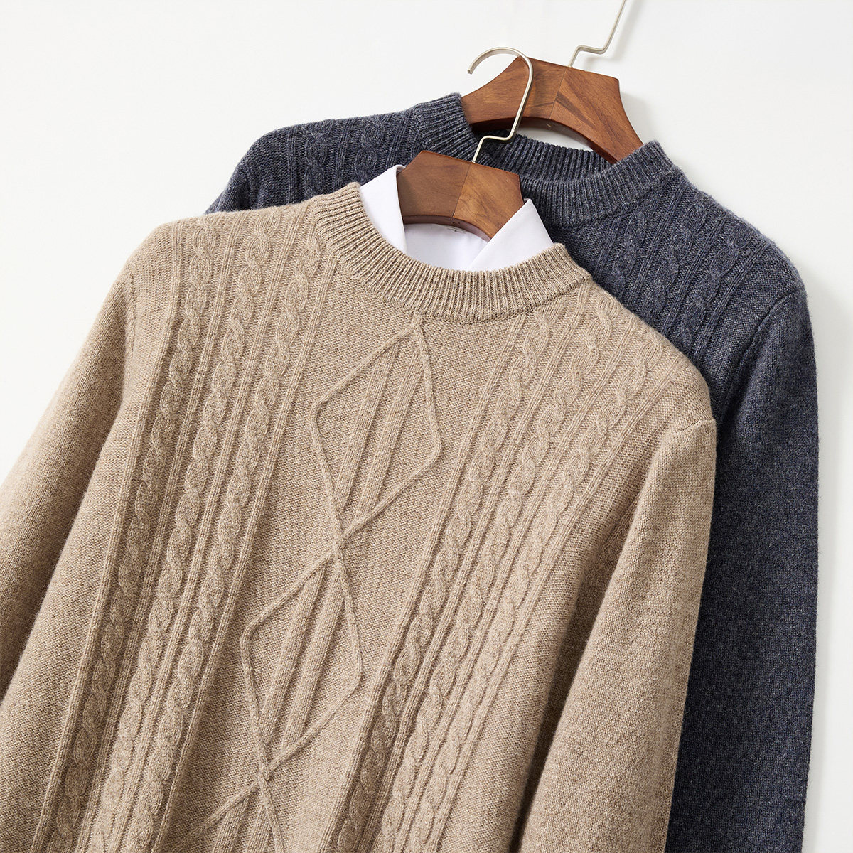 450g 定制款 26支双股全羊绒 男士绞花圆领毛衣 针织衫 秋冬男装