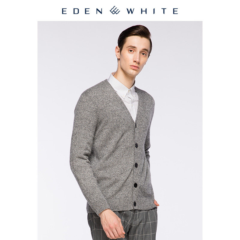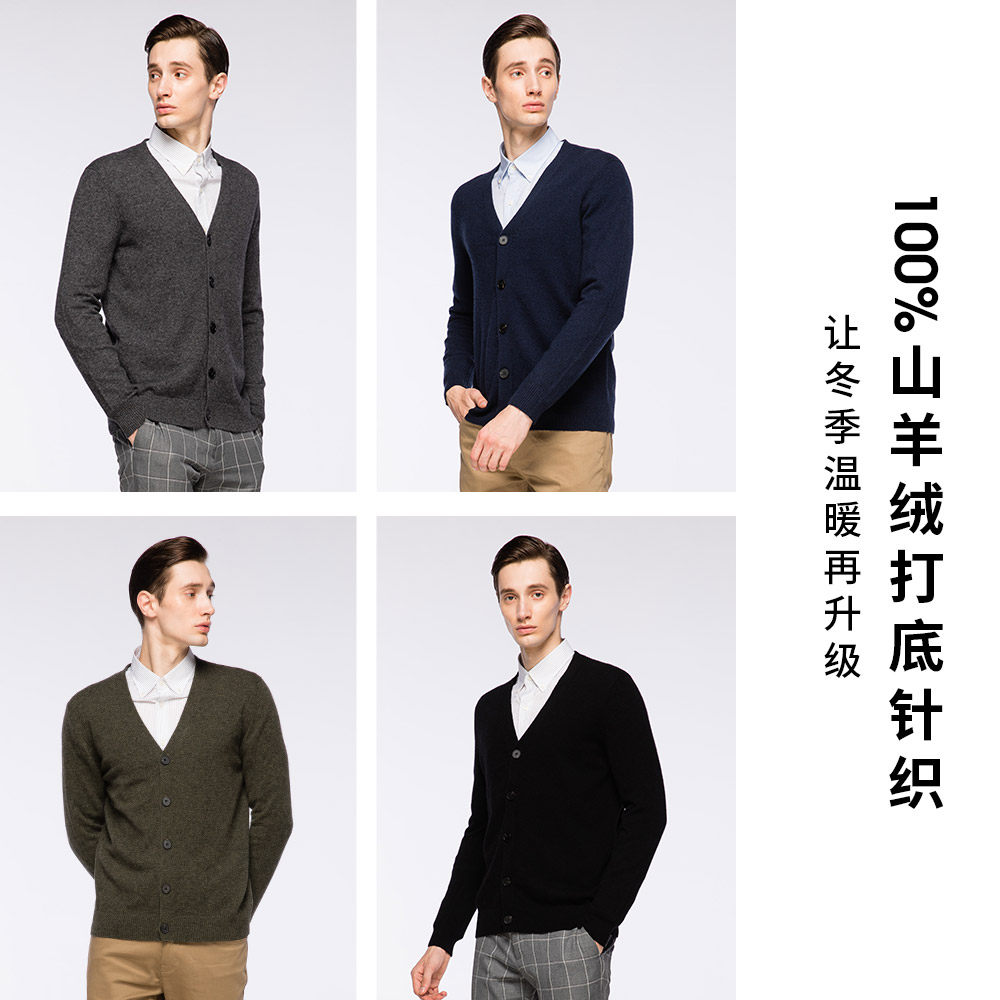 天猫圣雪绒冬季100%纯羊绒衫男V领简约纯色休闲商务修身长袖针织开衫