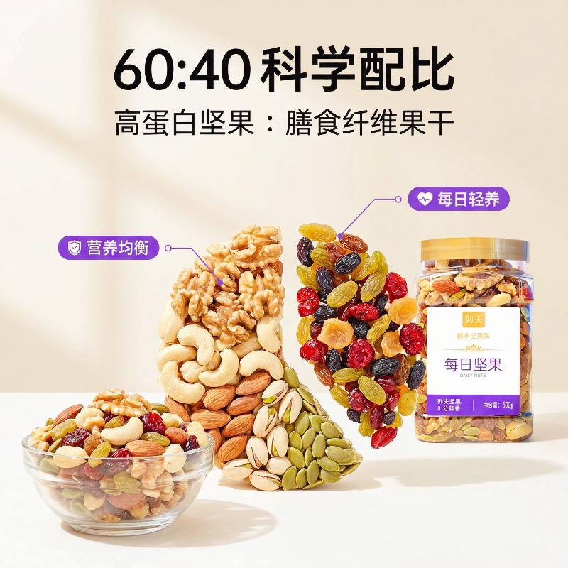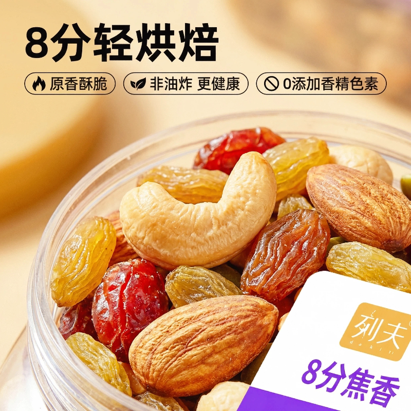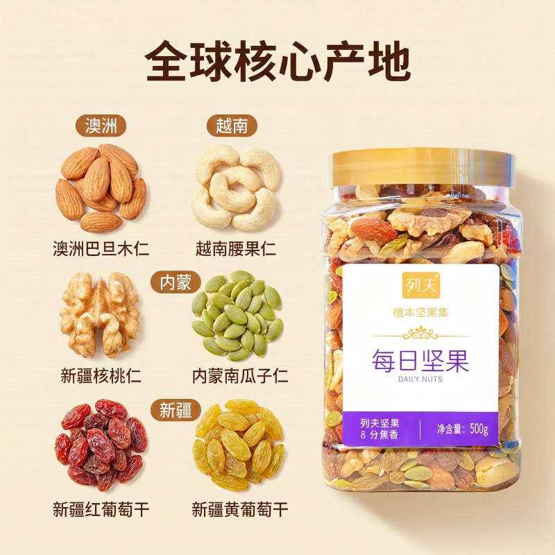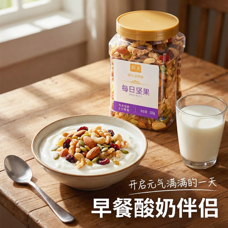 列夫每日坚果精选6种优质坚果与果干科学配比,包含核桃、腰果、扁桃仁、榛子、蓝莓干与蔓越莓干,无添加防腐剂、香精与色素,采用低温烘焙工艺,非油炸更健康。每罐500g大容量装,营养均衡,富含不饱和脂肪酸、蛋白质、膳食纤维及多种维生素,适合孕妇、上班族及学生作为健康代餐零食。独立罐装设计,密封保鲜,方便携带,开盖即食。无论是早餐搭配、下午茶点还是孕期加餐,列夫每日坚果都是天然美味、营养全面的选择,助力每一天活力满满。