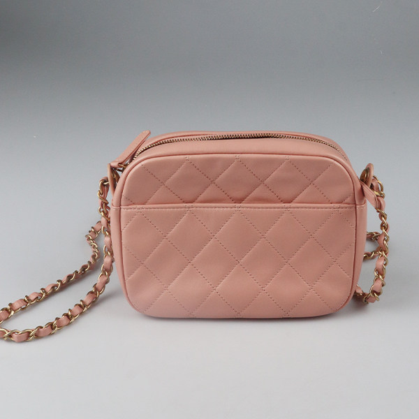 「9.0新」CHANEL 香奈儿 FRONT LOGO 链条相机包,采用细腻粉色牛皮材质,质感柔韧高级,搭配经典金色链条肩带,可斜挎或单肩背,优雅实用兼具。包身小巧精致,正面压印醒目CHANEL双C LOGO,彰显品牌辨识度。内部结构合理,设有卡位与主隔层,轻松容纳日常 essentials。整体成色接近全新(9.0新),五金光亮无磨损,皮质无明显划痕,保存完好。无论是搭配休闲装或优雅裙装,都能为造型增添一抹法式浪漫与奢华气质,是CHANEL经典与现代设计完美融合的典范之作,极具收藏与实用价值。