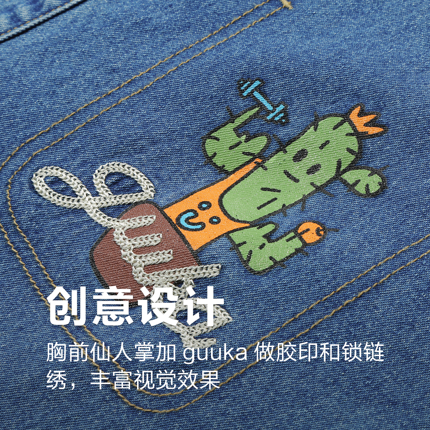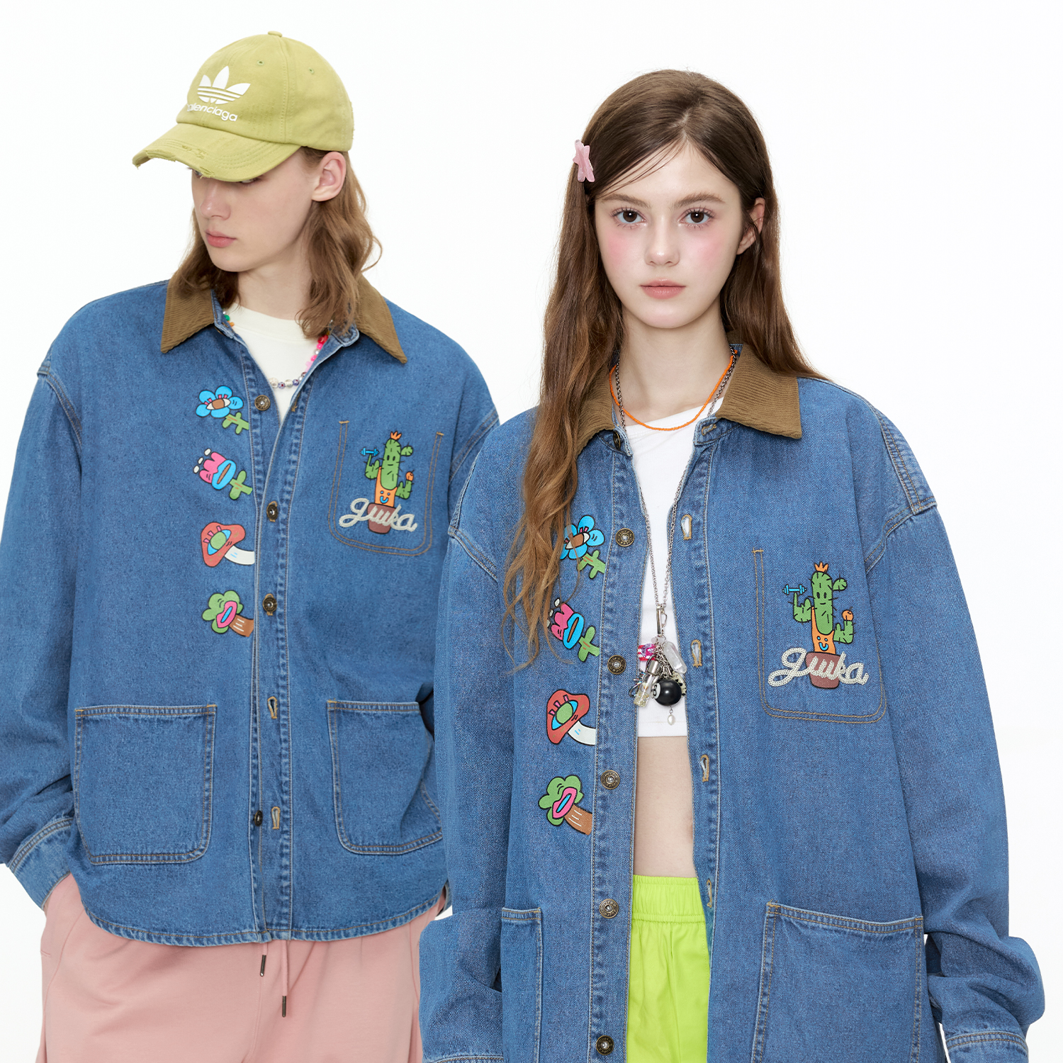 天猫GUUKA潮牌蓝色仙人掌牛仔衬衫男秋季 灯芯绒翻领长袖衬衣正肩外套