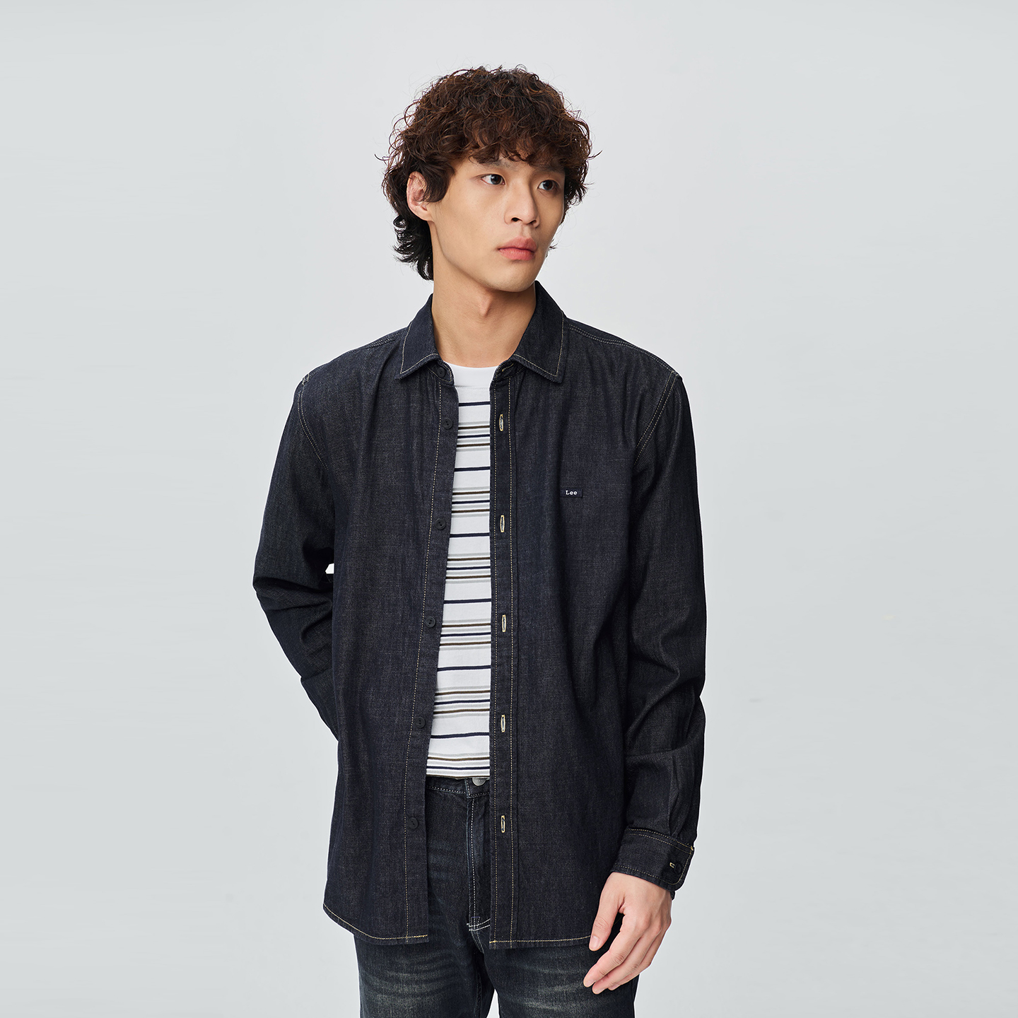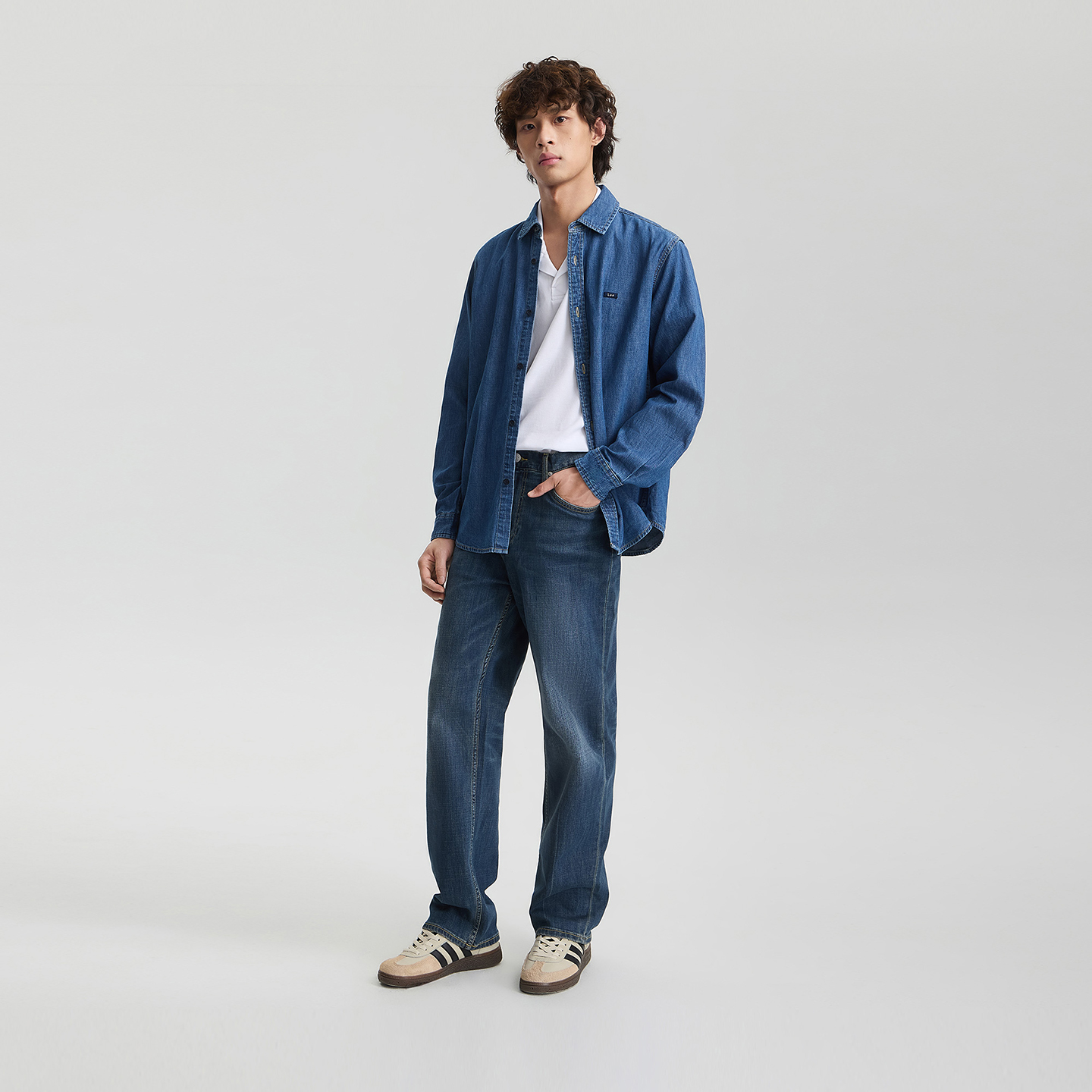 天猫Lee商场同款25秋冬新品舒适版翻领小Logo徽章男长袖牛仔衬衫休闲