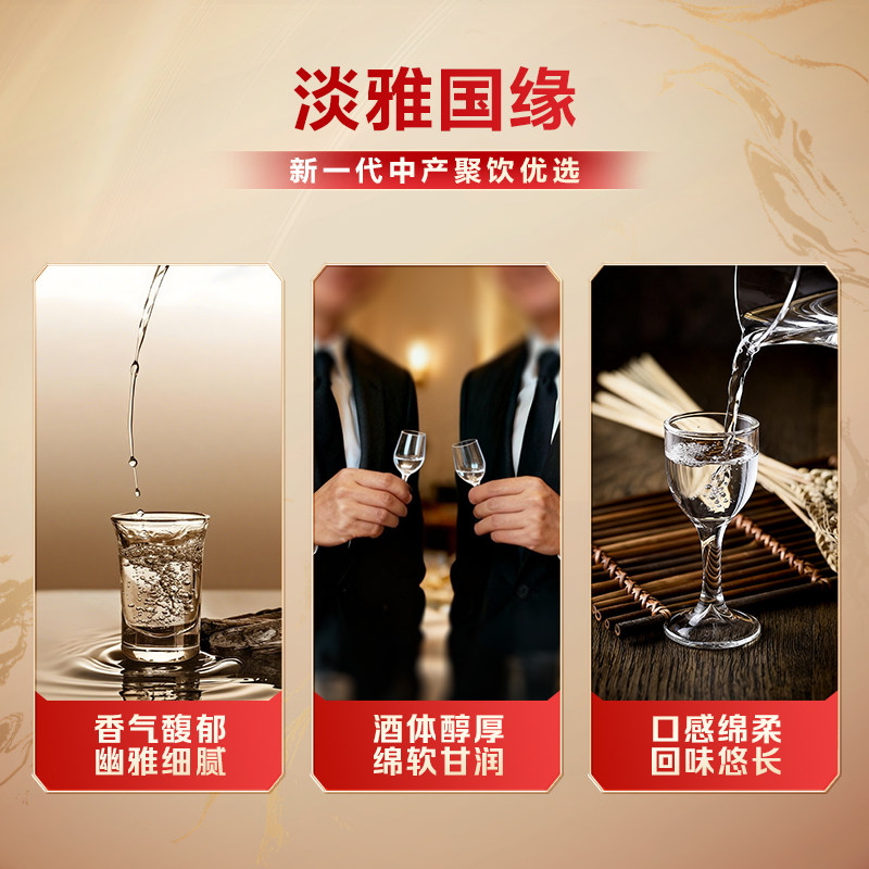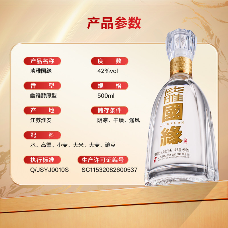 【42度】国缘淡雅醇厚高档白酒,源自江苏今世缘酒业,精选优质高粱、小麦等纯粮酿造,传承古法工艺,经多年窖藏陈酿而成。酒体清澈透明,香气幽雅,入口绵甜醇厚,回味悠长,完美融合传统与现代口感。500ml×2瓶装设计大气典雅,红色礼盒包装寓意吉祥喜庆,彰显尊贵品位。无论是节日团聚、拜访长辈,还是商务馈赠,皆显诚意与敬意。今世缘品牌深耕白酒文化,以“缘”为媒,传递情感与祝福。此酒品质卓越,口感柔和,适合中老年人饮用,是表达孝心与敬意的理想之选,让每一份馈赠都饱含深情与温度。