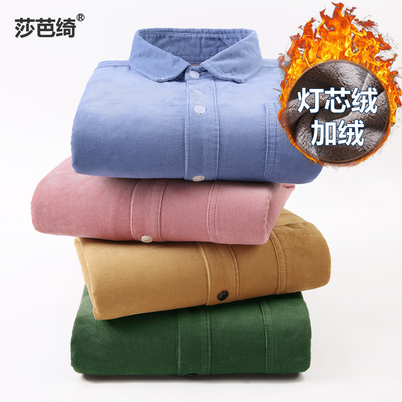 天猫秋冬纯棉灯芯绒加绒加厚男装保暖衬衫长袖大码粉色保暖衬衣男上衣