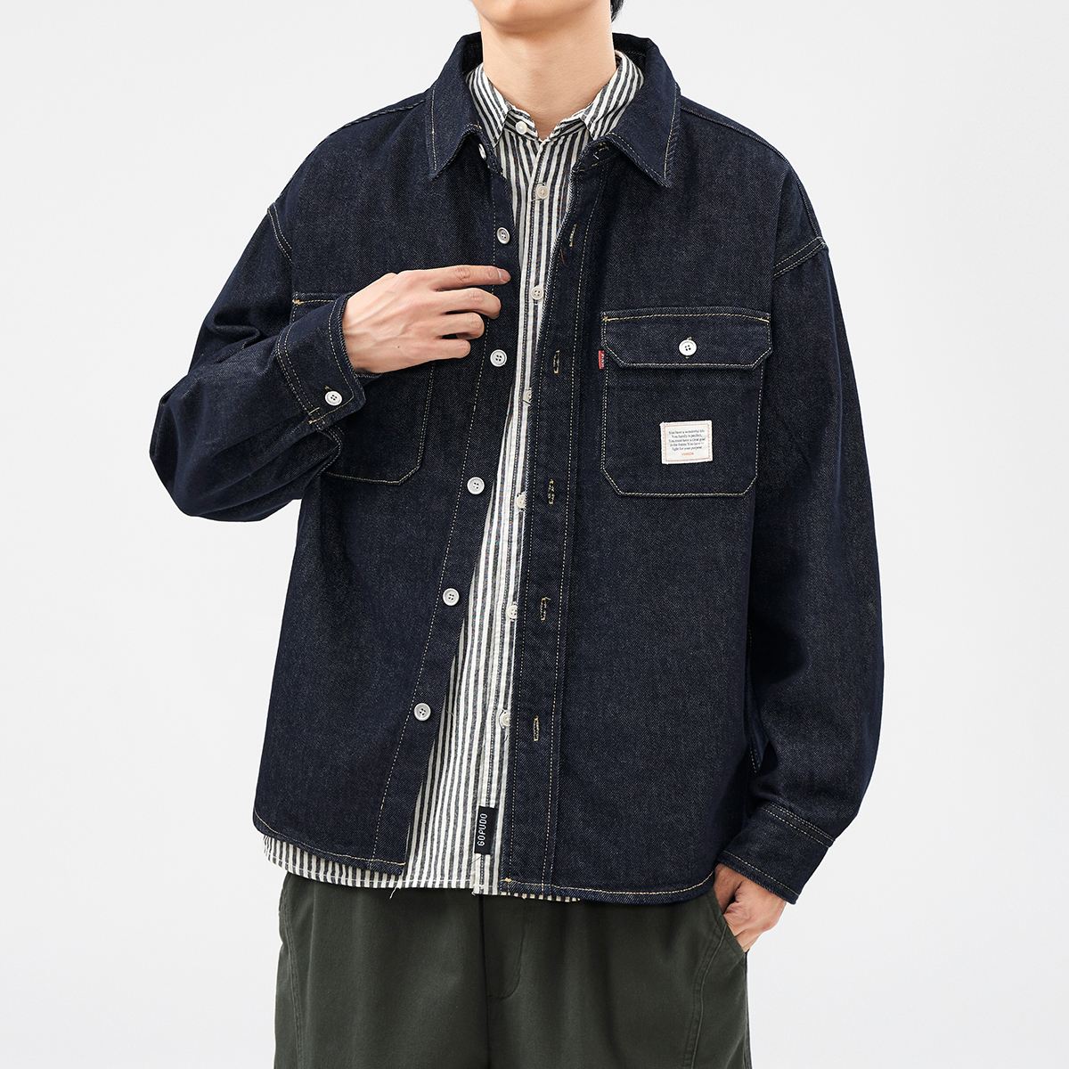 三川一禾男士时尚复古双袋牛仔衬衫秋季新款宽松休闲衬衣外套上衣