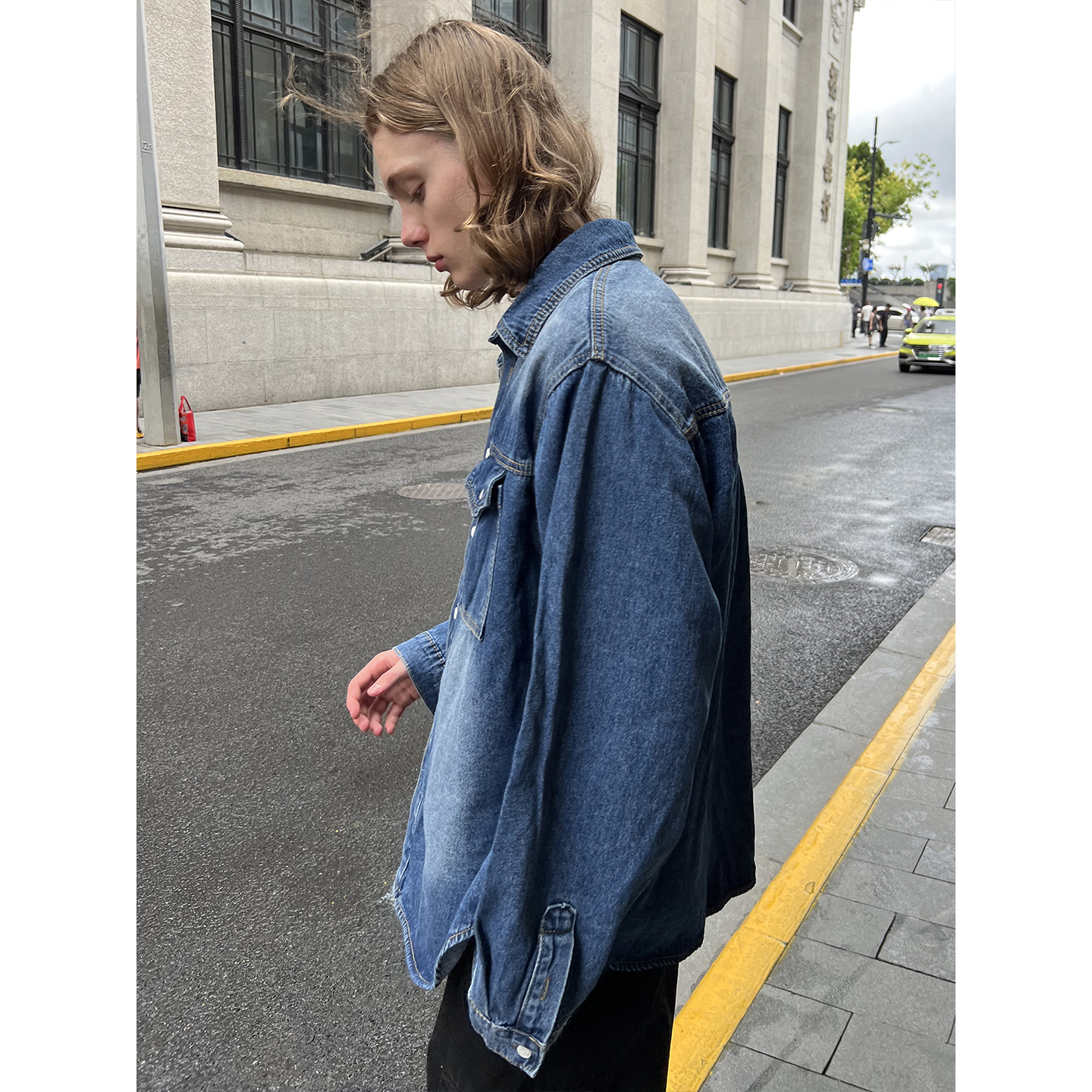淘宝EMP 春秋复古水洗做旧蓝色长袖牛仔衬衫男女美式宽松翻领开衫外套