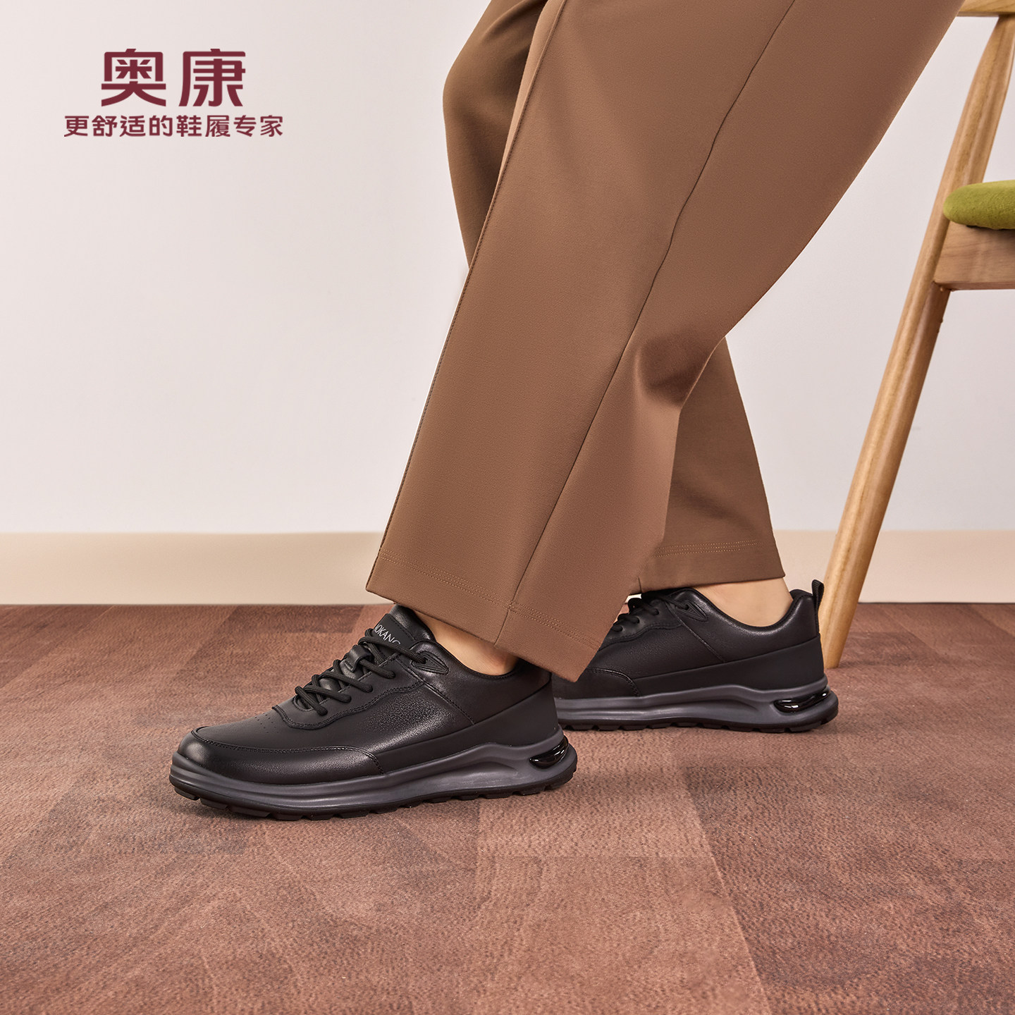 天猫奥康 男鞋春季新款运动皮鞋黑色上班通勤防水防滑系带透气休闲鞋