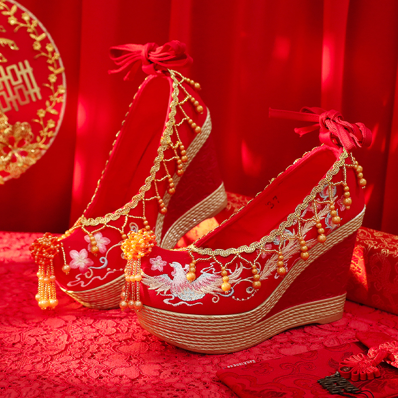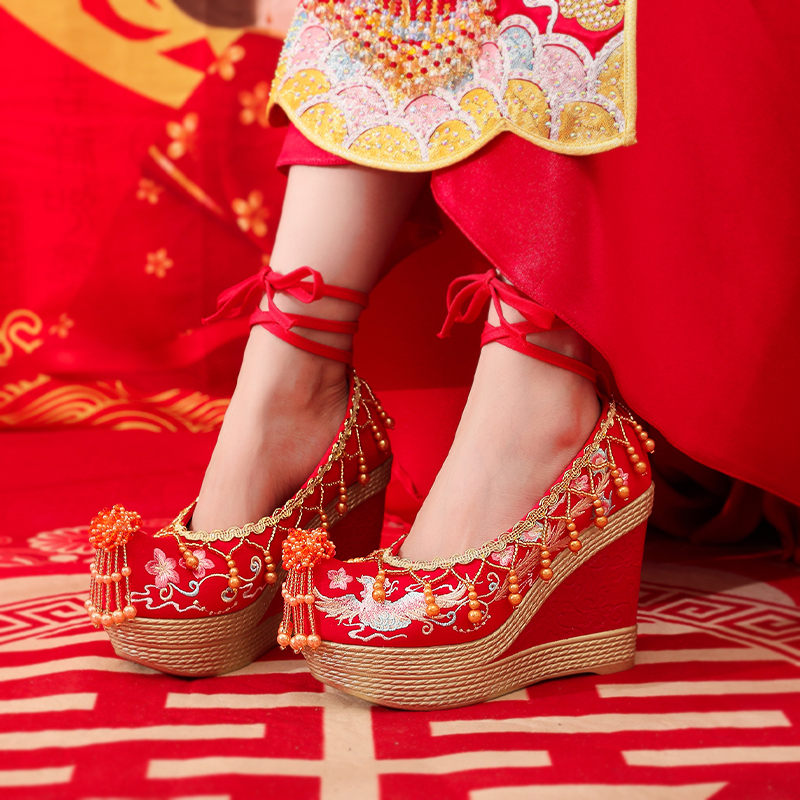 淘春夏新款新娘秀禾婚鞋红色内增高汉服鞋中式结婚鞋翘头绣花婚鞋女
