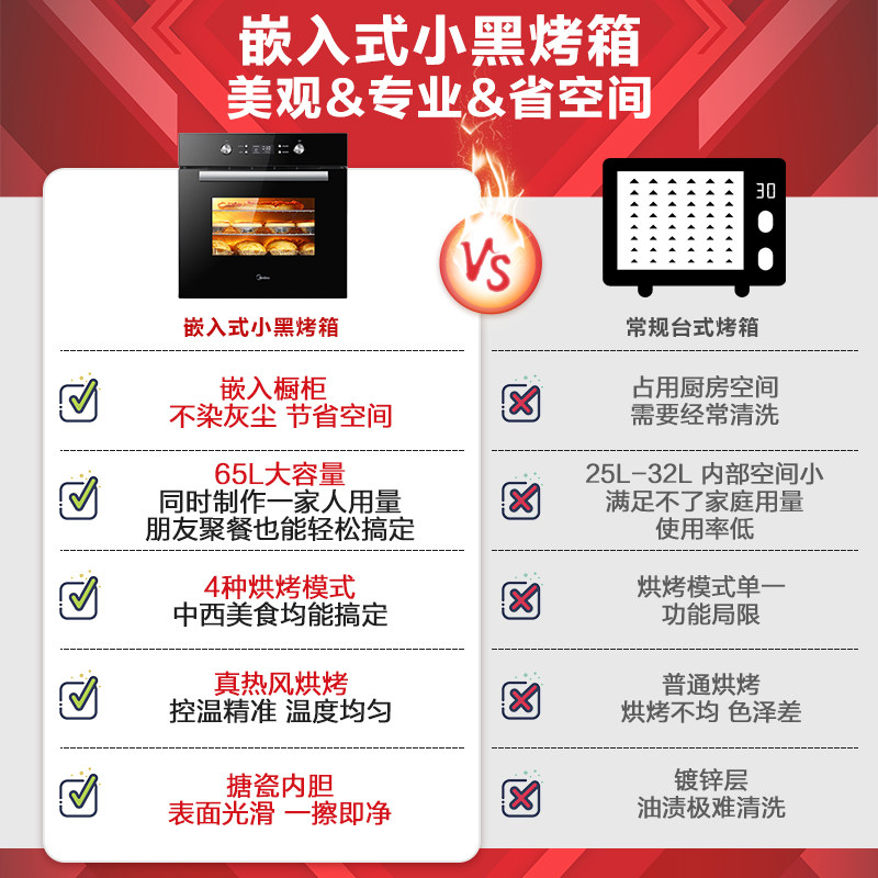 天猫【热销爆款】美的嵌入式电烤箱家用65升大容量小嘿EA0565GC-01SE