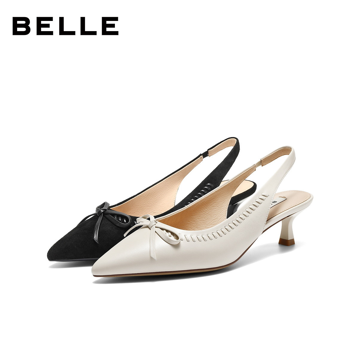 天猫百丽气质羊皮高跟包头后空凉鞋女26夏新商场款蝴蝶结细跟BJB31B