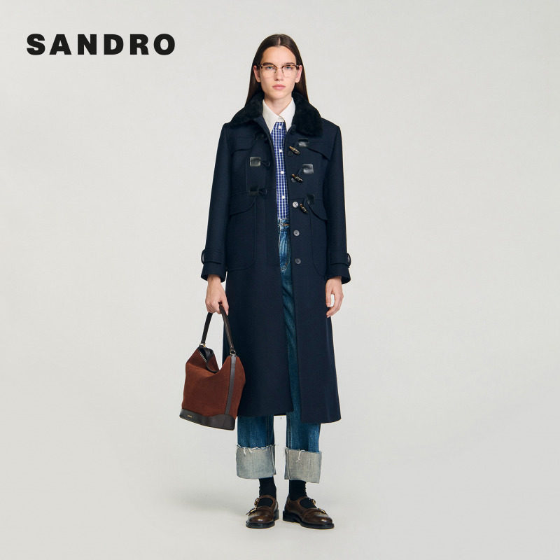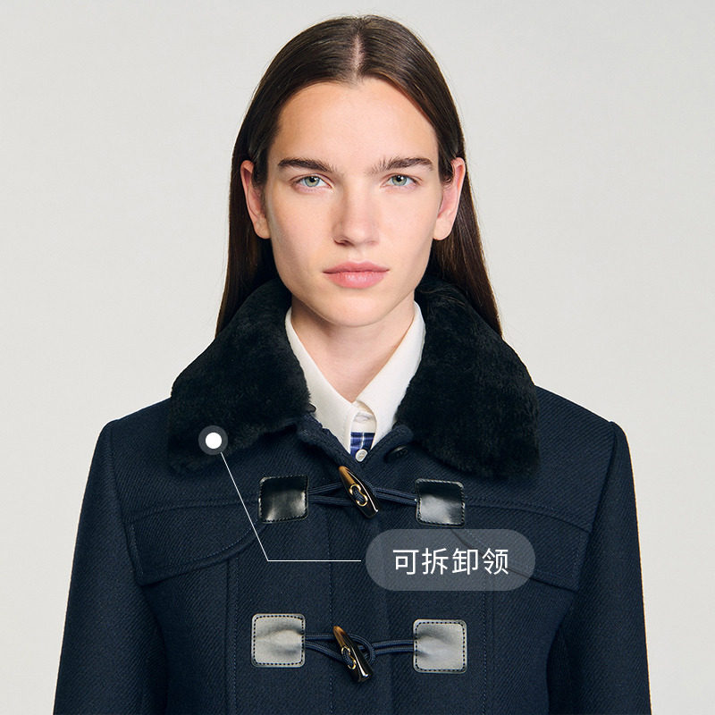 天猫季末7折SANDRO2025秋冬女装法式可拆卸毛领复古牛角扣A字毛呢大衣