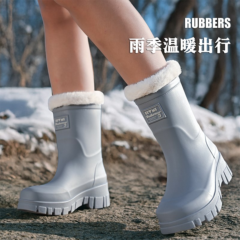 时尚低帮雨鞋女厚底女鞋内增高雨靴一体绒户外防水鞋低筒保暖胶鞋
