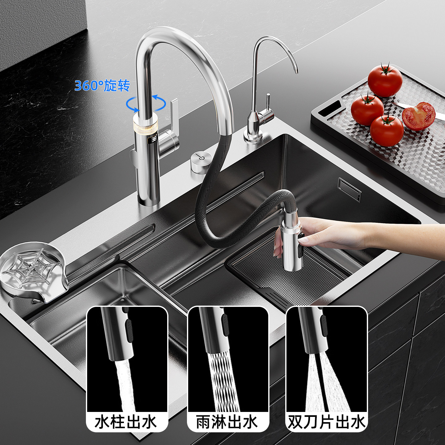 天阿萨斯升降水龙头厨房水槽冷热净水三合一枪黑色洗菜盆抽拉式龙头