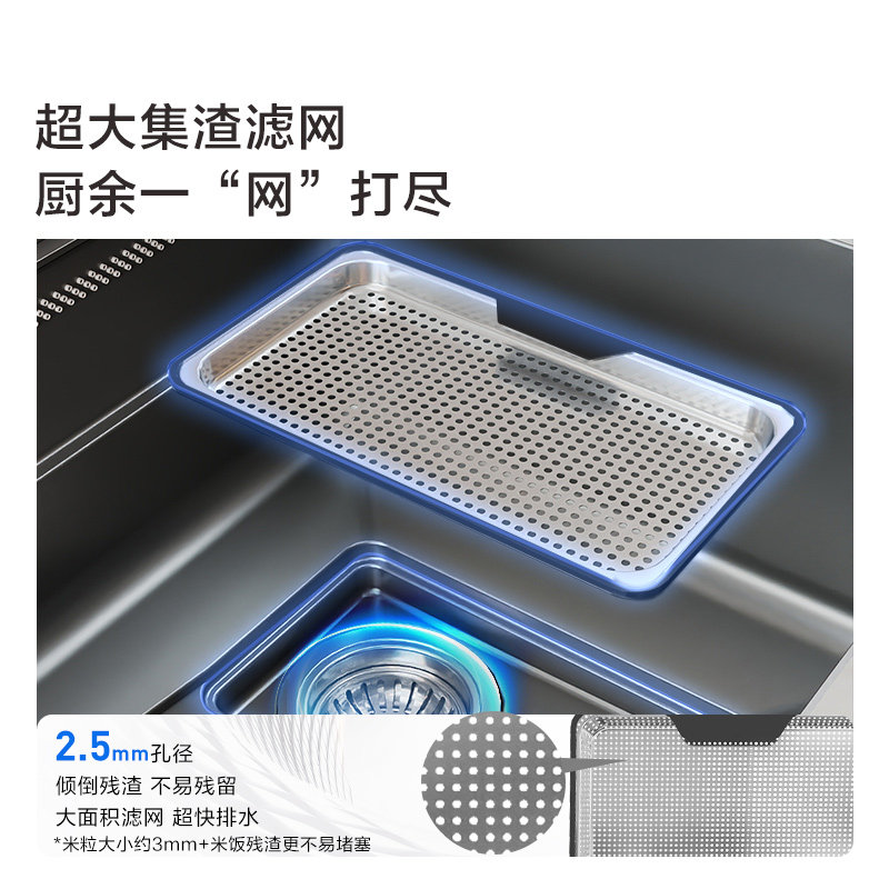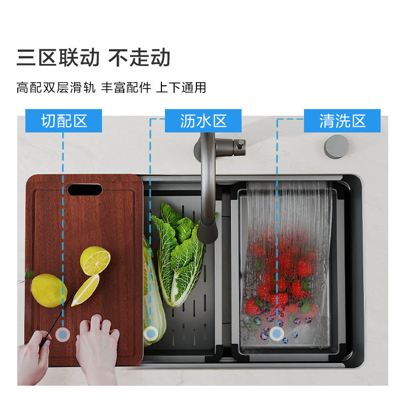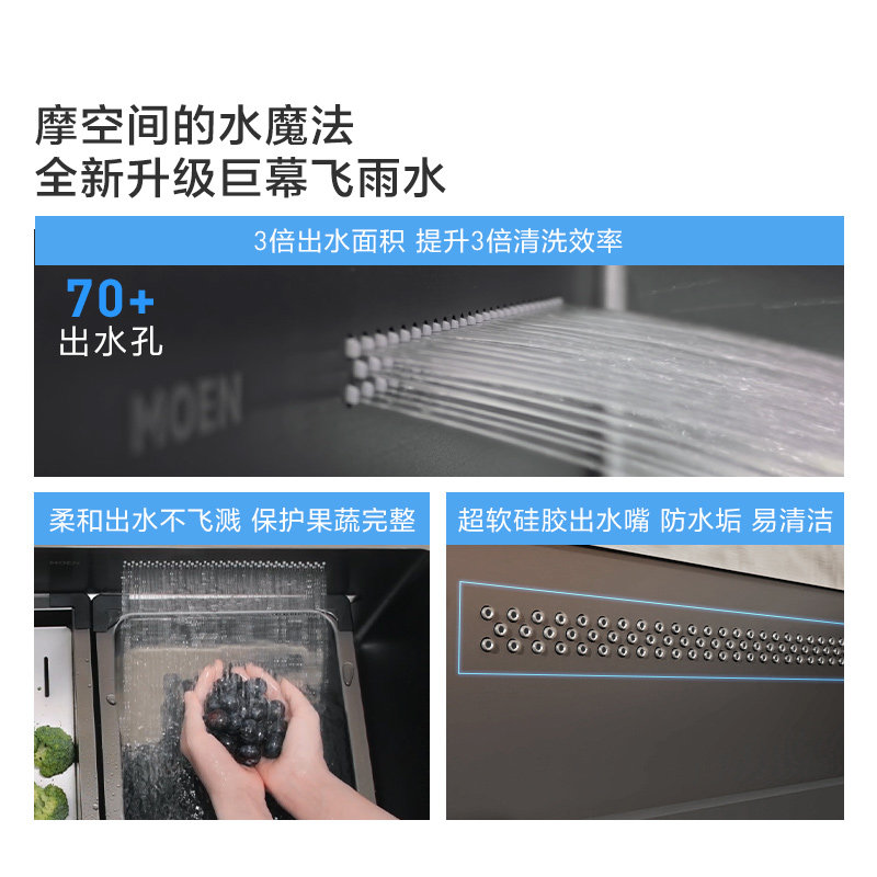 摩恩摩空间厨房水槽套装采用优质304不锈钢材质,坚固耐用,抗腐蚀、易清洁。大单槽设计提供宽敞操作空间,满足洗菜、洗碗、浸泡等多种需求。独特的瀑布飞雨式下水口设计,不仅美观时尚,更有效提升排水效率,防止堵塞。搭配高品质抽拉式龙头,360°自由旋转,精准控制水流,清洁更便捷。整体线条简洁流畅,适配现代厨房风格,兼具实用性与美观性。安装稳固,密封性好,有效防漏防臭。摩恩品牌保障,品质可靠,是提升厨房体验的理想之选。
