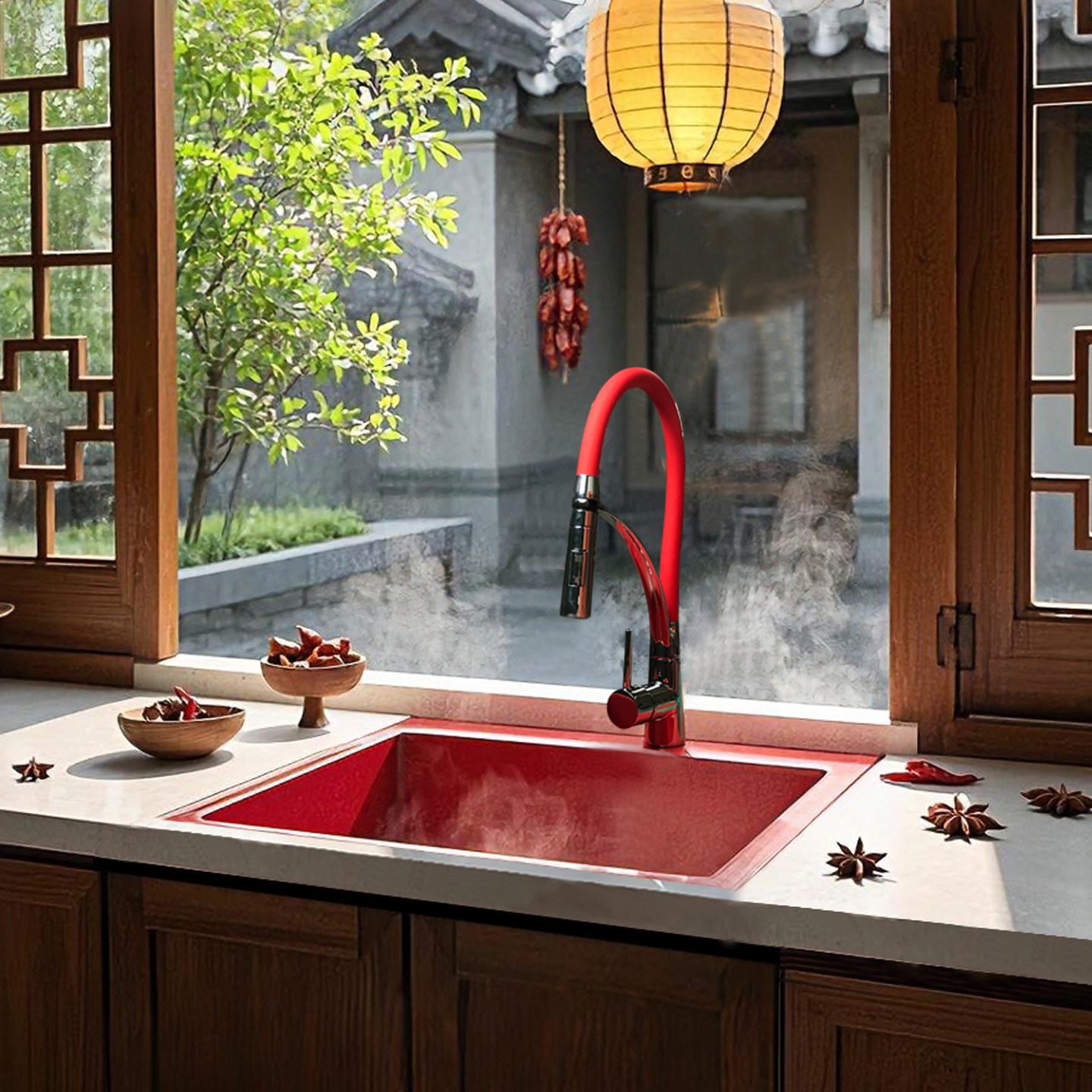 这款正红色石英石静音水槽,专为现代厨房设计,采用高密度石英复合材料打造,质地坚硬、耐磨抗刮,长期使用不易褪色或开裂。独特的台下式安装设计,美观易清洁,有效防止积水外溢。内置静音降噪层,有效降低水流冲击噪音,营造安静烹饪环境。搭配304不锈钢抽拉龙头,360°自由旋转,出水柔和不溅水,清洁更便捷。正红色外观时尚亮眼,为厨房增添一抹活力与高级感。整体结构稳固耐用,抗冲击、耐高温,适用于各种家庭使用场景,是兼具颜值与实用性的理想洗菜盆选择。