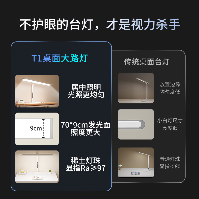 大满贯台式桌面大路灯T1是一款专为儿童学习设计的护眼台灯,采用先进的全光谱LED技术,模拟自然光照明,有效减少蓝光危害,提供均匀、无频闪的柔和光线,呵护孩子视力健康。其独特的“大路灯”结构设计,光线覆盖范围广,桌面无暗区,有助于预防近视、控制眼轴增长。灯头可多角度调节,满足不同学习场景需求。内置智能感光系统,自动调节亮度,保持舒适用眼环境。T1通过多项权威护眼认证,是学生长时间阅读、写作业的理想照明选择,助力孩子专注学习,守护明亮双眸。