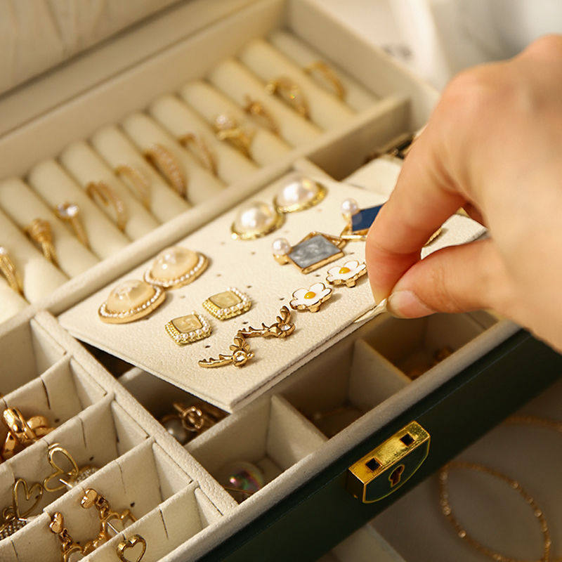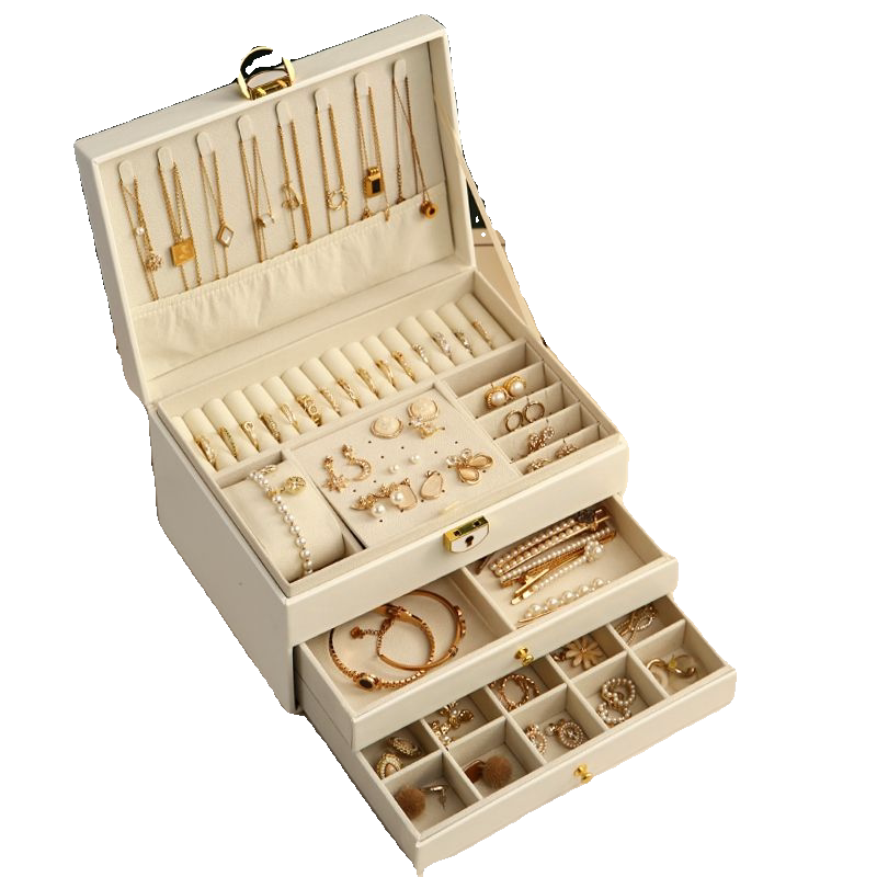 这款高档精致的珠宝收纳盒,专为收纳耳环、耳钉、项链、戒指及黄金手饰等贵重饰品而设计。采用优质环保材质打造,内衬细腻绒布,有效防刮耐磨,呵护每一件珠宝的光泽与质感。多层分区设计,搭配可调节隔板与独立抽屉,实现大容量有序收纳,取用便捷。外观典雅大气,配以精致锁扣与金属提手,兼具美观与实用性。无论是日常使用还是作为礼品赠送,都彰显品味与格调,是爱美女性的理想之选,让珠宝井然有序,绽放璀璨光芒。