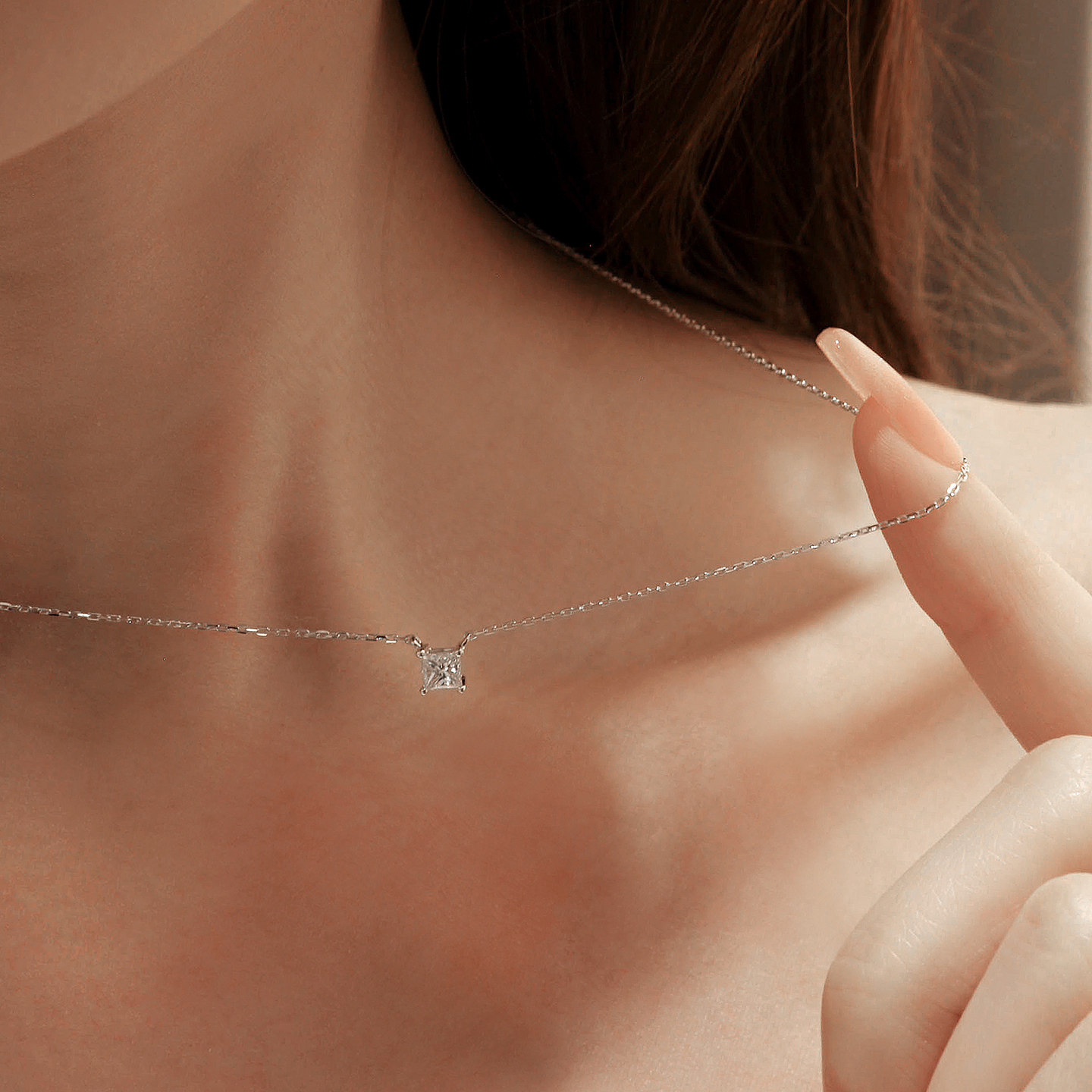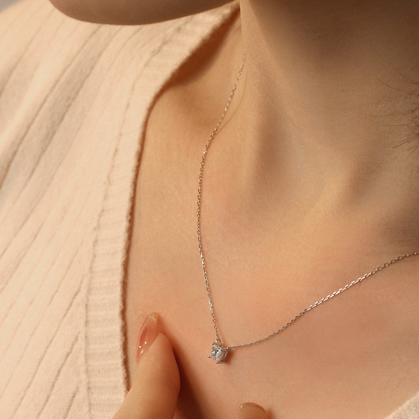 天猫WithLove 白18K金公主方钻石项链方形单钻吊坠轻奢小众锁骨链女
