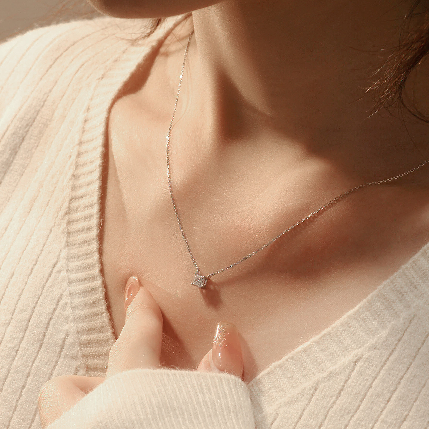 WithLove白18K金公主方钻石项链,以简约轻奢的设计诠释现代女性的优雅与自信。精选高品质公主方形单钻,璀璨火彩在光线下熠熠生辉,象征纯粹坚定的爱意。18K白金材质坚固耐磨,光泽持久,搭配精致锁骨链设计,贴合颈部曲线,凸显锁骨美感。整体造型简约而不失高级感,适合日常佩戴或重要场合点缀,是小众时尚女性的理想之选。无论是自用还是赠礼,这款项链都传递着细腻情感与独特品味,让每一位佩戴者在举手投足间散发迷人光彩。