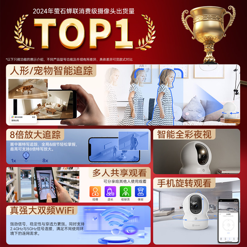 萤石摄像头C6c是一款专为家庭设计的智能安防设备,支持手机远程高清监控,让您随时随地掌握家中动态。采用1080P高清画质,搭配110°广角镜头与数字云台,实现水平360°、垂直105°全景覆盖,无死角守护家庭安全。内置红外夜视功能,即使在暗光环境下也能清晰成像。支持双向语音通话,便于远程沟通。通过萤石云APP,用户可实时查看、回放录像,并接收移动侦测报警推送。支持Wi-Fi无线连接,安装简便,适用于客厅、婴儿房、老人居室等多种场景,是守护家庭安全的贴心之选。