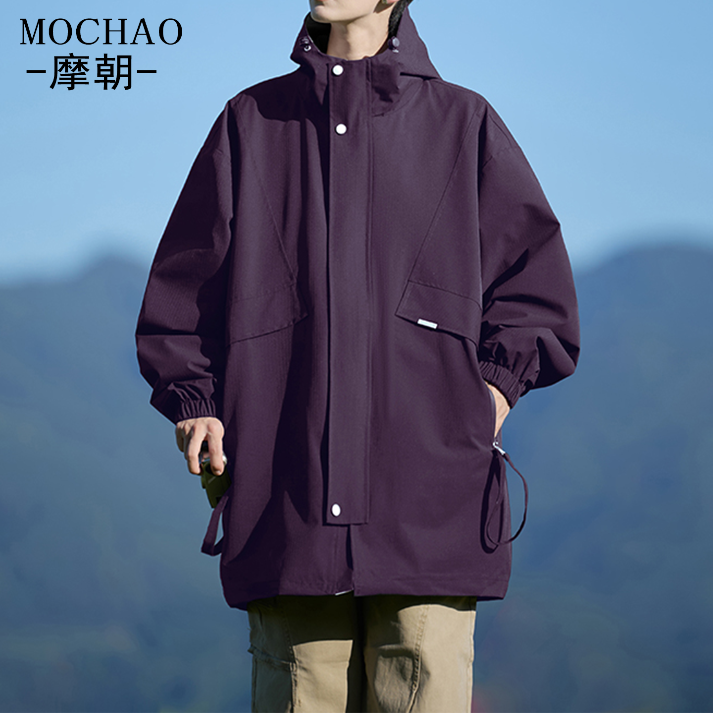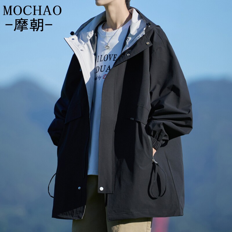 天猫摩朝大码中长款外套男士春秋款工装夹克宽松潮牌加肥加大连帽风衣
