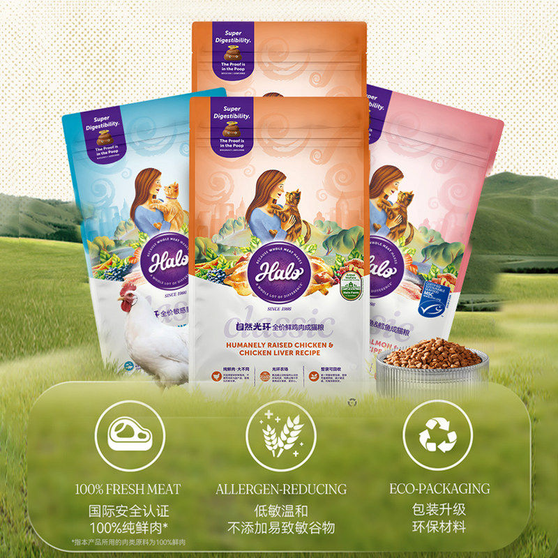 Halo自然光环猫粮10斤实惠装,专为成猫设计的全价主食猫粮,采用低敏配方,精选纯鲜肉为主要原料,不含谷物、人工添加剂及副产品,有效降低猫咪过敏风险。其高消化率的天然成分有助于改善软便问题,呵护敏感肠胃。富含优质动物蛋白、必需氨基酸及Omega脂肪酸,支持毛发亮泽、肌肉强健与整体健康。10斤大容量包装,性价比极高,适合多猫家庭或追求高品质喂养的铲屎官。Halo坚持人道饲养与可持续理念,让爱猫吃得健康又安心,是兼顾营养、安全与实惠的理想选择。