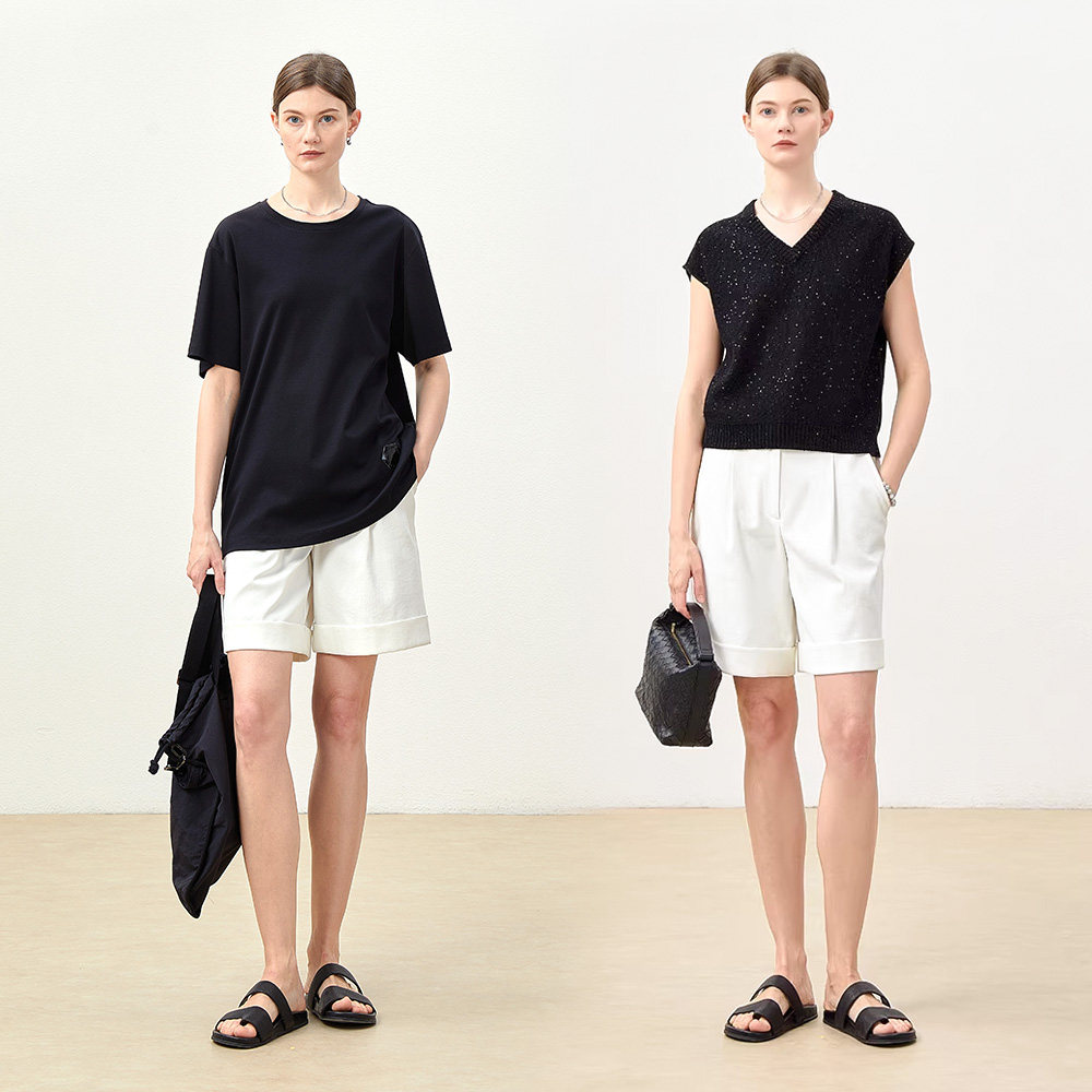 三福短袖女2026新款夏季小个子简约休闲V领修身短款t恤上衣女装