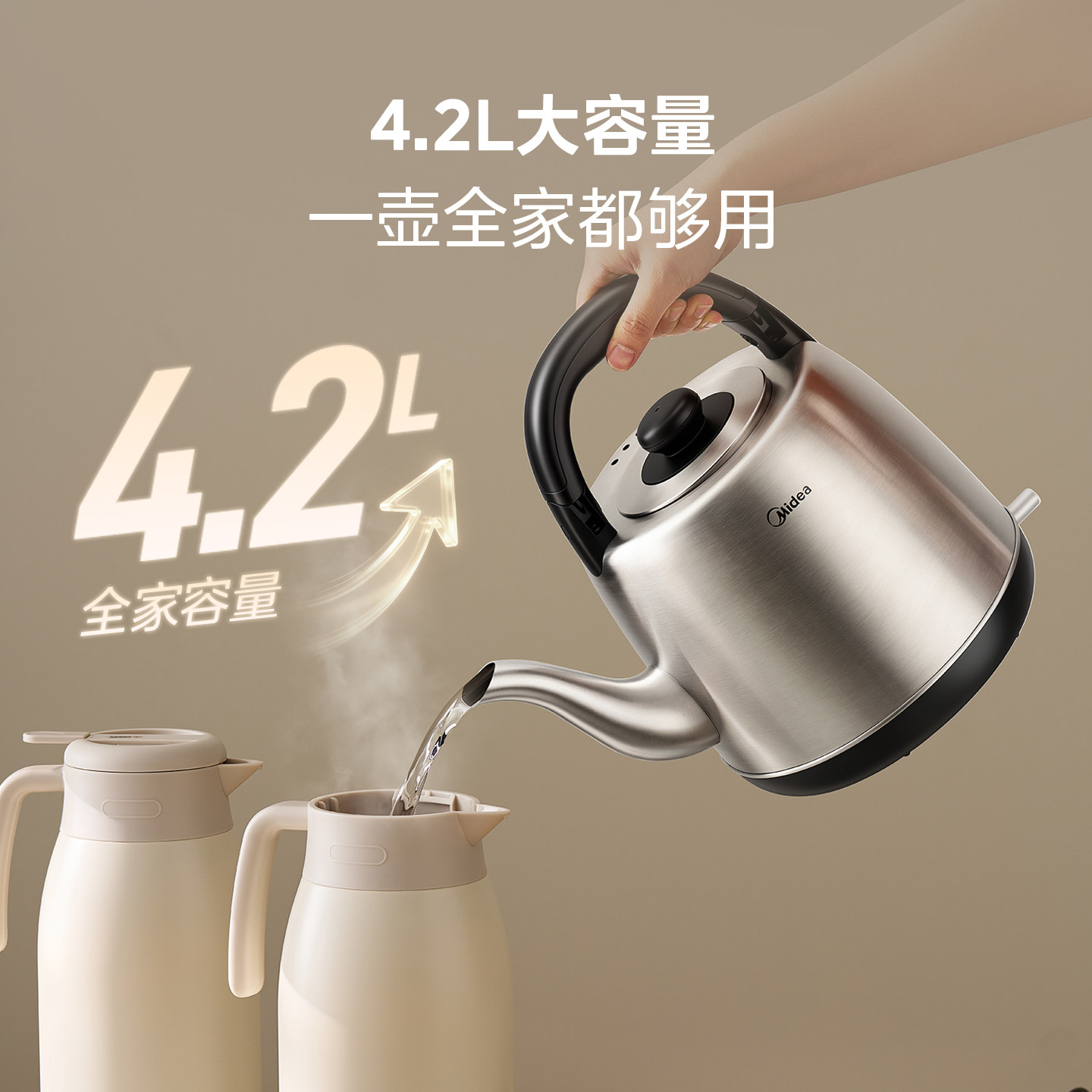 美的电热水壶,大容量设计,满足全家日常饮水需求,高效烧水,快速沸腾,省时便捷。采用食品级304不锈钢内胆,安全无异味,耐腐蚀、易清洁,保障水质健康。全自动温控系统,水沸后自动断电,防干烧保护,使用更安心。壶身防烫设计,手柄舒适握感,倒水稳定不滴漏。简约时尚外观,适配多种家居风格。官方正品保障,品质可靠,是居家、办公或送礼的理想选择。无论是自用还是赠予亲友,美的电热水壶都以卓越性能与贴心设计,带来安心便捷的饮水体验,是现代家庭不可或缺的厨房好帮手。