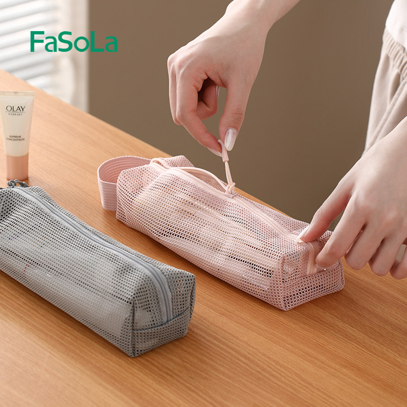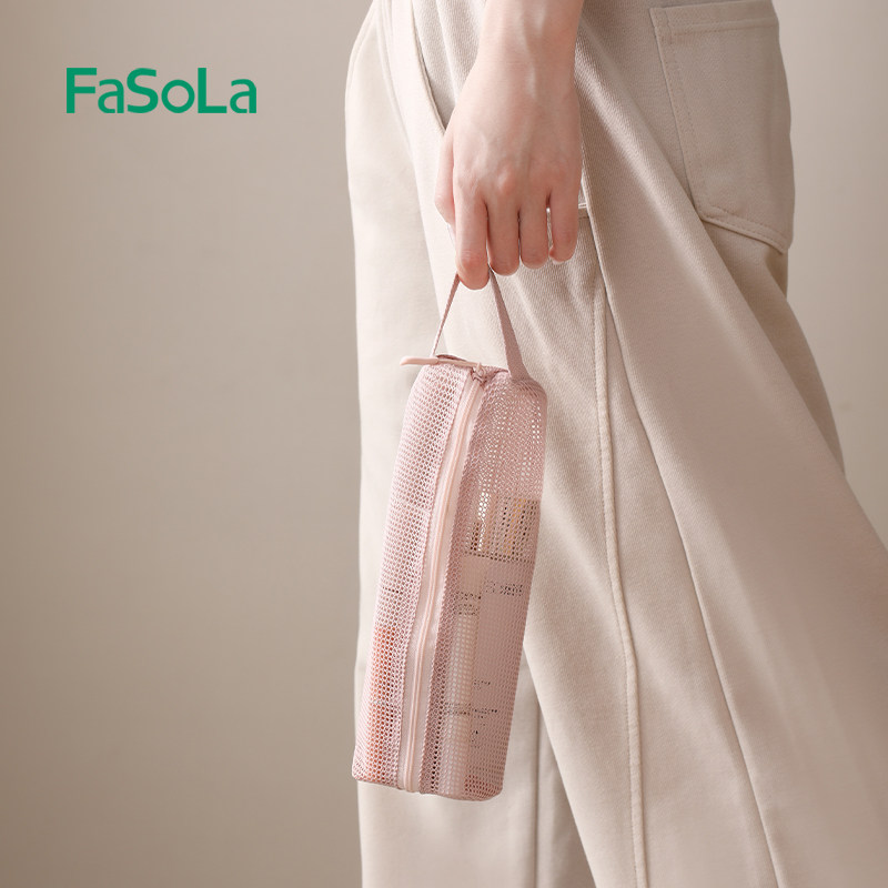 FaSoLa洗漱包化妆刷包是一款专为出差旅行设计的便携收纳袋,采用高品质透明网纱材质,轻盈透气且防水耐脏,方便快速查找内部物品。包内分区合理,设有弹性固定带和分隔层,可稳固收纳化妆刷、护肤品、洗漱用品等,避免碰撞损坏。拉链顺滑耐用,密封性好,有效防止液体渗漏。小巧轻便,可轻松放入行李箱或手提包中,是旅行、出差、日常通勤的理想伴侣。透明设计一目了然,节省整理时间,让出行更从容有序。FaSoLa致力于为您提供实用、美观、高品质的收纳解决方案。